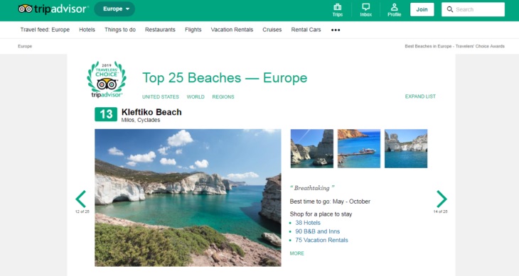 Σύμφωνα με το TripAdvisor η παραλία Κλέφτικο στη Μήλο, διακρίθηκε ανάμεσα στις 25 καλύτερες παραλίες σε ευρωπαϊκό επίπεδο.