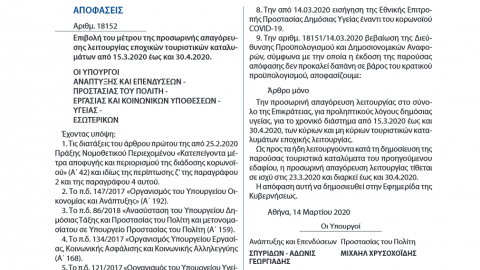 Κοινή Υπουργική Απόφαση έλαβαν οι υπουργοί Ανάπτυξης και Επενδύσεων, Προστασίας του Πολίτη, Εργασίας και Κοινωνικών Υποθέσεων, Υγείας και Εσωτερικών, με την οποία επιβάλλεται προσωρινή απαγόρευση λειτουργίας των εποχικών τουριστικών καταλυμάτων από 15 Μαρτίου έως και το τέλος Απριλίου, στο πλαίσιο λήψης προληπτικών μέτρων ενάντια στην εξάπλωση του κορωνοϊού.