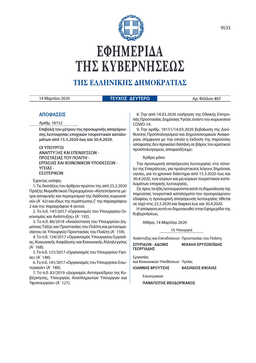 Την προσωρινή απαγόρευση λειτουργίας στο σύνολο της Επικράτειας, για προληπτικούς λόγους δημόσιας υγείας, για το χρονικό διάστημα από 15.3.2020 έως και 30.4.2020, των κύριων και μη κύριων τουριστικών καταλυμάτων εποχικής λειτουργίας.