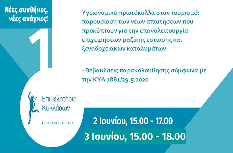 Τέλος, σας ενημερώνουμε ότι στον σύνδεσμοhttps://www.e-kyklades.gr/images/30_5_20_Protokolo_ygeionomiko_2084_F-5… μπορείτε να βρείτε ολόκληρο το ΦΕΚ που περιλαμβάνει τα «Ειδικά πρωτόκολλα υγειονομικού περιεχομένου βάσει των οποίων λειτουργούν οι τουριστικές επιχειρήσεις στο πλαίσιο της λήψης μέτρων έναντι του κορωναϊού COVID-19».