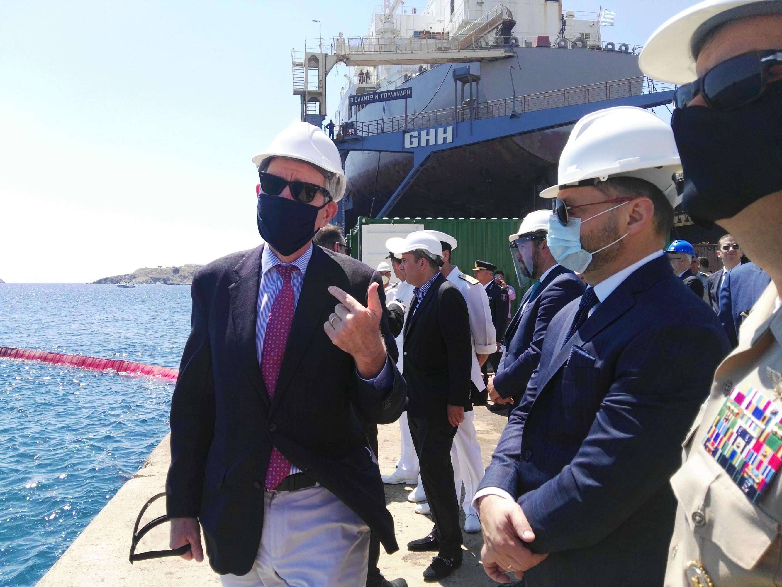 Αμέσως μετά την παρουσίαση των δύο βίντεο για το πέρασμα του Νεωρίου από το παρελθόν, στο παρόν και το μέλλον, ακολούθησε η ξενάγηση του κ. Πάιατ και των τεσσάρων Υπουργών στις εγκαταστάσεις του ναυπηγείου, από τις οποίες παρακολούθησαν άσκηση απορρύπανσης της θάλασσας, από την πλευρά του Λιμεναρχείου Σύρου και των καβοδετών, με τη συνδρομή πλωτών μέσων.