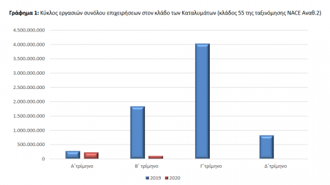 Προκειμένου να αναγνωστούν σωστά τα παρακάτω δεδομένα της ΕΛΣΤΑΤ, υπενθυμίζεται, ότι στις 12 Μαρτίου ανεστάλη η λειτουργία όλων των χώρων διασκέδασης, ενώ την επομένη ανακοινώθηκε αναστολή λειτουργίας, μεταξύ άλλων, για καφετέριες, μπαρ και εστιατόρια. Επίσης, στις 19 Μαρτίου το Υπουργείο Τουρισμού ανακοίνωσε την αναστολή λειτουργίας του συνόλου σχεδόν των ξενοδοχείων και καταλυμάτων. Μεσολάβησε το διάστημα του περιορισμού της κυκλοφορίας πολιτών (lockdown) από τις 23 Μαρτίου έως τις 4 Μαΐου. Στις 25 Μαΐου επαναλειτούργησαν οι επιχειρήσεις εστίασης, ενώ την 1η Ιουνίου επαναλειτούργησαν τα ξενοδοχεία δωδεκάμηνης λειτουργίας και στις 15 Ιουνίου τα υπόλοιπα τουριστικά καταλύματα.