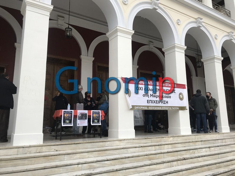 Στην διαμαρτυρία που διοργάνωσε ο Εμπορικός Σύλλογος της Πάτρας έξω από το Δημοτικό Θέατρο “Απόλλων” συμμετείχαν εκπρόσωποι της δημοτικής Αρχής, του Εργατικού Κέντρου, του Συλλόγου Εμποροϋπαλλήλων, καθώς και ο πρόεδρος του ΣΚΕΑΝΑ, Σπύρος Στεργίου.
