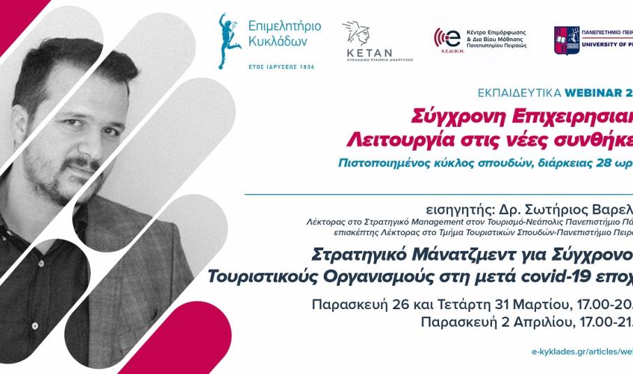 Στρατηγικό Μάνατζμεντ για Σύγχρονους Τουριστικούς Οργανισμούς στη μετά covid-19 εποχή ο Δρ. Σωτήριος Βαρελάς, Λέκτορας στο Στρατηγικό Management στον Τουρισμό-Νεάπολις Πανεπιστήμιο Πάφου, επισκέπτης Λέκτορας στο Τμήμα Τουριστικών Σπουδών-Πανεπιστήμιο Πειραιώς.