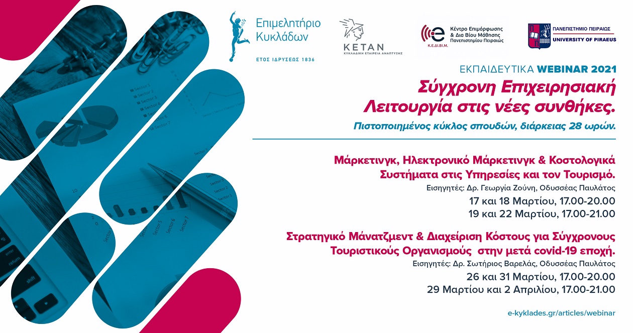 Με την πεποίθηση ότι η γνώση των νέων δεδομένων είναι δύναμή μας, το Επιμελητήριο Κυκλάδων ξεκινά δυναμικά την προετοιμασία των μελών του εν όψει της νέας τουριστικής σεζόν με έναν νέο πιστοποιημένο κύκλο σπουδών, ειδικά διαμορφωμένο για τις ανάγκες των επιχειρήσεων στις Κυκλάδες την εποχή της πανδημίας, σε συνεργασία με το Κέντρο Επιμόρφωσης & Διά Βίου Μάθησης του Πανεπιστημίου Πειραιώς, την Τετάρτη 17 Μαρτίου 2021. Στόχος είναι να προσφέρει στα μέλη του έγκυρη ενημέρωση και να συμβάλει στην αναβάθμιση των γνώσεων και των δεξιοτήτων τους προκειμένου να ανταπεξέλθουν στις νέες συνθήκες που έχει διαμορφώσει η πανδημία και τις αλλαγές στις τάσεις, τις ανάγκες και τις προοπτικές του Τουρισμού, που αποτελεί τη βασική επιχειρηματική δραστηριότητα των νησιών μας.