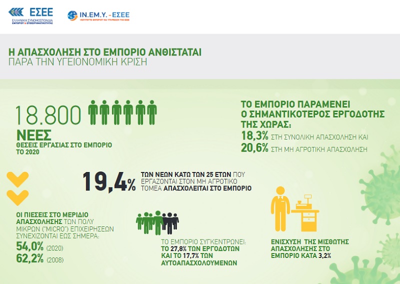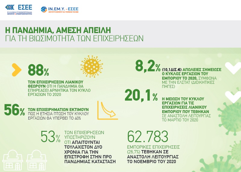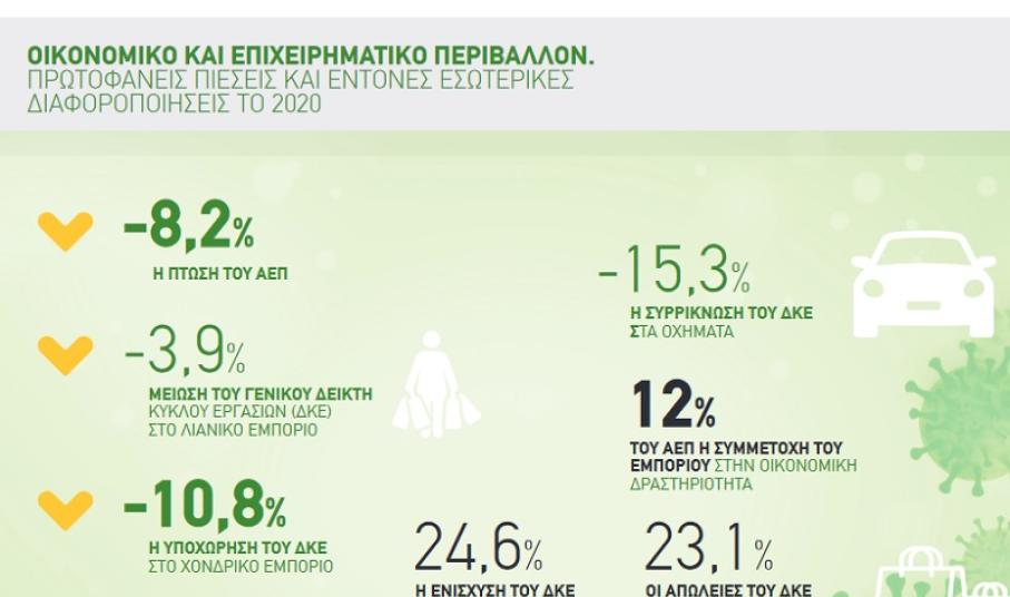 Σύμφωνα με την Έκθεση για το 2020 ο κλάδος δέχεται ισχυρές πιέσεις από το οικονομικό και επιχειρηματικό περιβάλλον, αλλά διατηρεί την σημαίνουσα συμμετοχή του στην οικονομική δραστηριότητα (12% του ΑΕΠ) παραμένοντας παράλληλα ο κυριότερος εργοδότης της χώρας (18,3% στη συνολική απασχόληση). Ωστόσο, η πανδημία συνιστά ιδιαίτερη απειλή για τις εμπορικές επιχειρήσεις καθώς το 88% αυτών θεωρεί πως ο Covid-19 θα επηρεάσει αρνητικά τον κύκλο εργασιών, ενώ το 56% των επιχειρήσεων εκτιμά πως η πτώση του κύκλου εργασιών θα υπερβεί το 40%.
