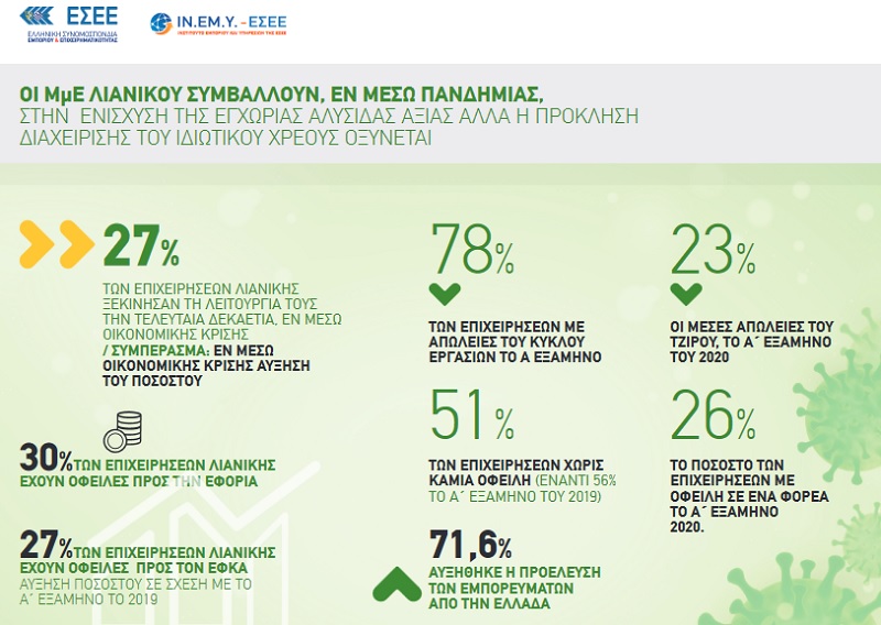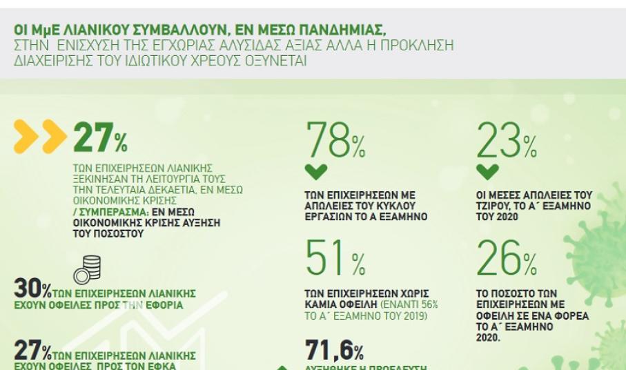 Σε αντίθεση με το 2019, που θεωρήθηκε το πρώτο έτος κανονικότητας της ελληνικής οικονομίας, η εικόνα της πανδημίας προοικονομεί μια σειρά από δυνητικούς κινδύνους βιωσιμότητας καθώς μειώθηκαν σημαντικά οι δυναμικές (σε 5%), οι αναπτυσσόμενες (σε 2%) αλλά και οι ανθεκτικές (σε 11%) επιχειρήσεις, πολλές από τις οποίες έδειχναν σημάδια βιωσιμότητας. Ωστόσο, ο σχεδόν διπλασιασμός των συνεπών επιχειρήσεων (σε 43%) δείχνει σημάδια μεσοπρόθεσμης βιωσιμότητας με το ζητούμενο να παραμένει ο άμεσος και ουσιαστικός μετασχηματισμός τους. Μεγάλο πρόβλημα είναι η αύξηση του αριθμού των απειλούμενων (από 18% σε 35%) που αποκαλύπτει το μεγαλύτερο κίνδυνο της πανδημίας, δηλαδή τη μετατροπή υγειών επιχειρήσεων σε προβληματικές, αφού σχεδόν 4 στις 10 επιχειρήσεις απειλούνται χάνοντας έσοδα και σωρεύοντας χρέη.