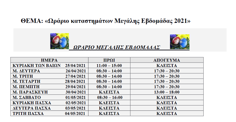 Το ωράριο λειτουργίας των εμπορικών καταστημάτων για την περίοδο του Πάσχα, κοινοποίησε ο Εμπορικός Σύλλογος Σύρου, μαζί με ευχές για Καλό Πάσχα, Υγεία και Ευημερία για όλους.