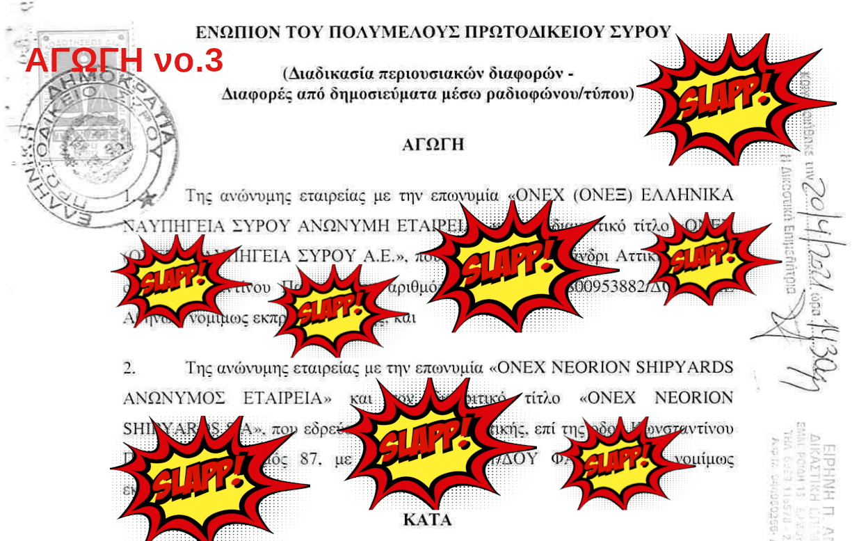 Σε συνέχεια των 2 αγωγών και των 4 εξώδικων που έχει στείλει ο όμιλος ONEX κατά του Παρατηρητηρίου Ποιότητας Περιβάλλοντος Σύρου και μελών του, στις 20/4/2021 μας παρέδωσε και ΤΡΙΤΗ αγωγή κατά του προέδρου και του Παρατηρητηρίου που αφορά τις συνεντεύξεις του πρώτου στην κα. Μπούλικα Μιχαλοπούλου στο Ράδιο ΜέΡΑ και στον κ. Διονύση Ελευθεράτο στο Κόκκινο 105,5 fm. Με τη νέα αυτή αγωγή οι εταιρείες αξιώνουν πάλι ποσά μεγαλύτερα του 1.000.000€ κάνοντας το άθροισμα των απαιτήσεων μέσω αγωγών να ξεπερνάει τα 3.000.000€.