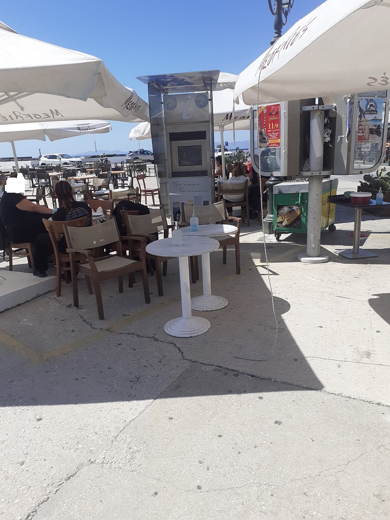 - Κατ’ εξακολούθηση παρεμπόδιση της πρόσβασης των επισκεπτών του infokiosk με την τοποθέτηση τραπεζοκαθισμάτων έμπροσθεν του μηχανήματος. Όλες οι προσπάθειες συμμόρφωσης έπεσαν στο κενό. Σας επισυνάπτουμε φωτογραφίες.