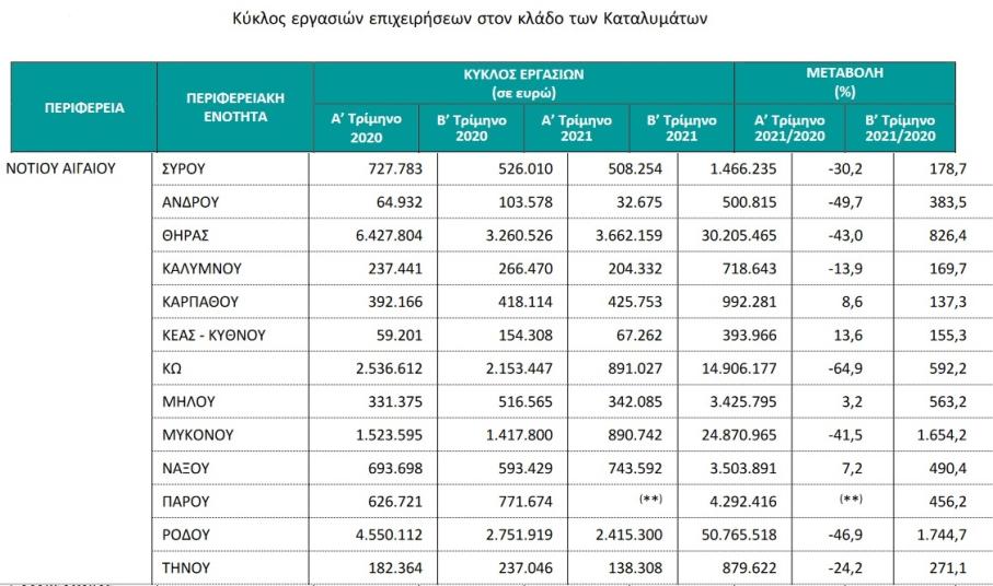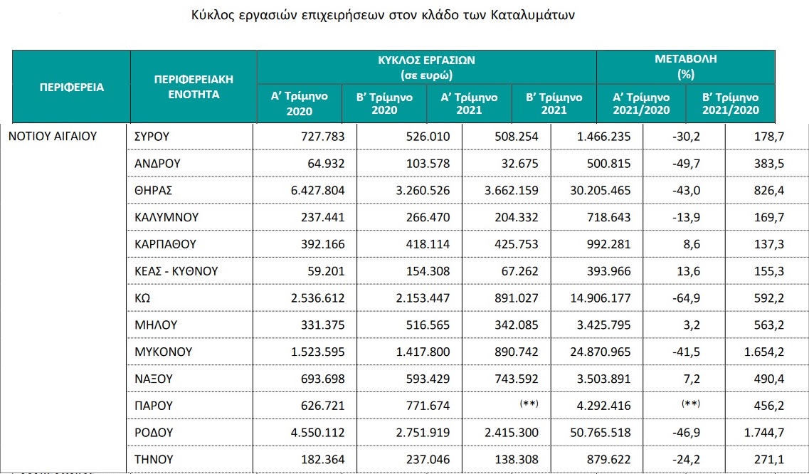 Για τις επιχειρήσεις του κλάδου καταλυμάτων με υποχρέωση τήρησης διπλογραφικών βιβλίων, για τις οποίες υπάρχουν διαθέσιμα στοιχεία σε μηνιαία βάση, ο κύκλος εργασιών τον Αύγουστο 2021 ανήλθε σε 1.292.785.740 ευρώ, σημειώνοντας αύξηση 133,6% σε σχέση με τον Αύγουστο 2020, όπου είχε ανέλθει σε 553.305.904 ευρώ. Για τις επιχειρήσεις των Περιφερειακών Ενοτήτων με συνεισφορά στον συνολικό κύκλο εργασιών έτους 2020 μεγαλύτερη από 1,0%, η μεγαλύτερη αύξηση στον κύκλο εργασιών τον Αύγουστο 2021 σε σύγκριση με τον Αύγουστο 2020 παρατηρήθηκε στην Περιφερειακή Ενότητα Χαλκιδικής (250,2%) και η μικρότερη αύξηση (93,9%) καταγράφηκε στην Περιφερειακή Ενότητα Ζακύνθου.