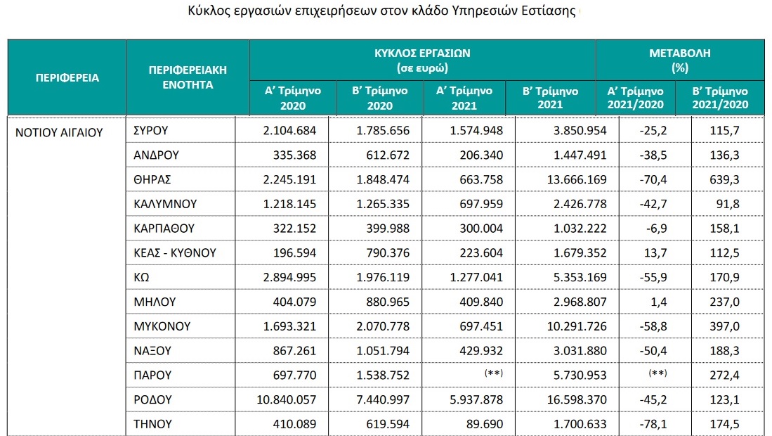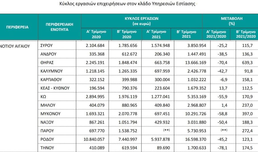 Για τις επιχειρήσεις του κλάδου υπηρεσιών εστίασης με υποχρέωση τήρησης διπλογραφικών βιβλίων, για τις οποίες υπάρχουν διαθέσιμα στοιχεία σε μηνιαία βάση, ο κύκλος εργασιών τον Αύγουστο 2021 ανήλθε σε 194.669.184 ευρώ, σημειώνοντας αύξηση 45,7% σε σχέση με τον Αύγουστο 2020, όπου είχε ανέλθει σε 133.576.499 ευρώ. Για τις επιχειρήσεις των Περιφερειακών Ενοτήτων με συνεισφορά στον συνολικό κύκλο εργασιών έτους 2020 μεγαλύτερη από 1,0%, η μεγαλύτερη αύξηση στον κύκλο εργασιών τον Αύγουστο 2021 σε σύγκριση με τον Αύγουστο 2020 παρατηρήθηκε στην Περιφερειακή Ενότητα Θήρας (71,5%) και η μικρότερη αύξηση (8,9%) καταγράφηκε στην Περιφερειακή Ενότητα Αργολίδας, ενώ μείωση καταγράφηκε στην Περιφερειακή Ενότητα Εύβοιας (7,9%).