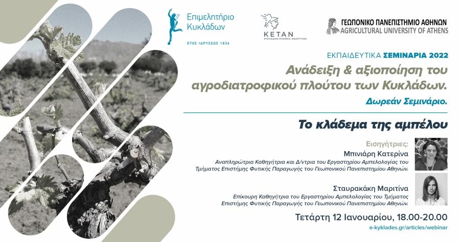 «Γενάρη μήνα κλάδευε, φεγγάρι μη γυρεύεις» λέει ο σοφός λαός, έτσι το πρώτο σεμινάριο που θα πραγματοποιηθεί την Τετάρτη 12 Ιανουαρίου 2022 αφορά τις σωστές πρακτικές κλαδέματος των αμπελιών στις Κυκλάδες, ενώ το δεύτερο θα πραγματοποιηθεί την Δευτέρα 7 Φεβρουαρίου 2022 με θέμα τους εμβολιασμούς των αμπελιών.
