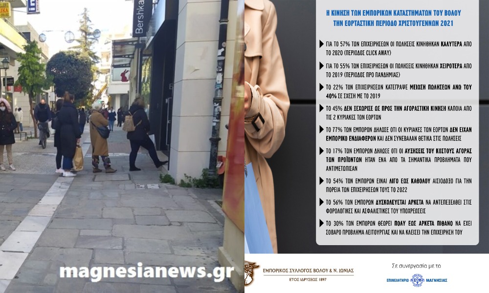 Τα παραπάνω στοιχεία προέκυψαν από την δειγματοληπτική έρευνα με θέμα «Εμπορική κίνηση εορταστικής περιόδου Χριστουγέννων & Πρωτοχρονιάς 2021», που διεξήγαγε ο Εμπορικός Σύλλογος Βόλου σε συνεργασία με το Επιμελητήριο Μαγνησίας.