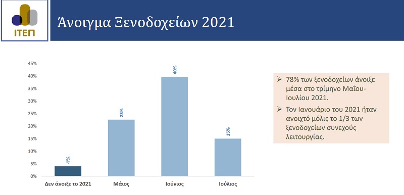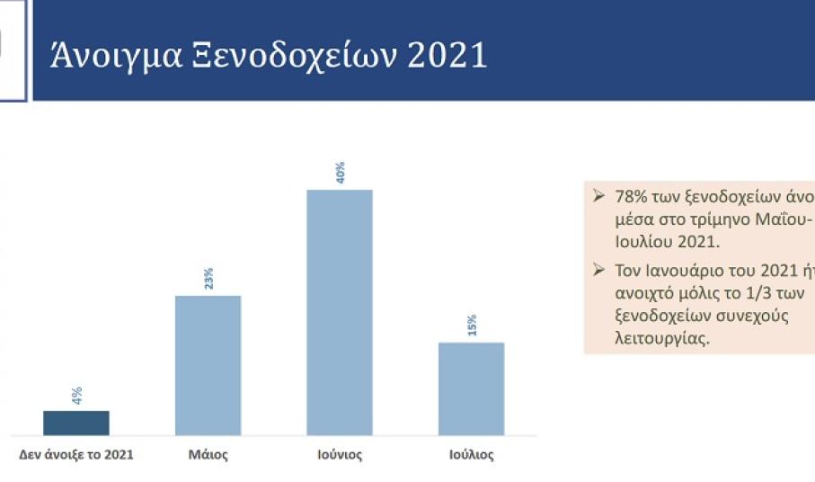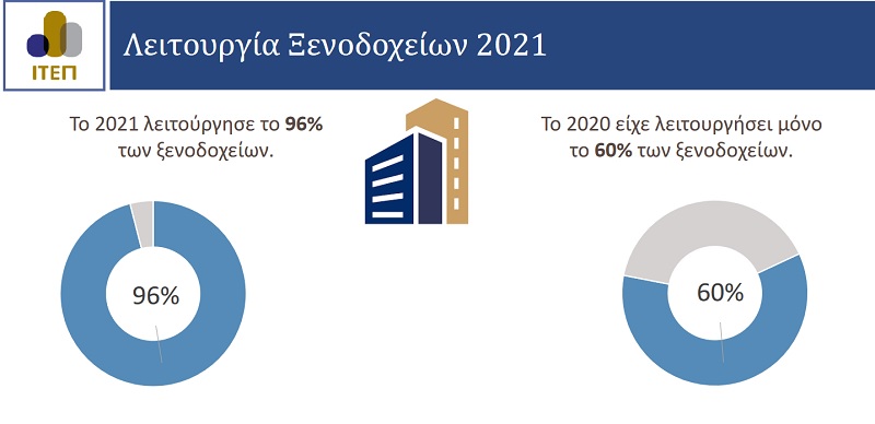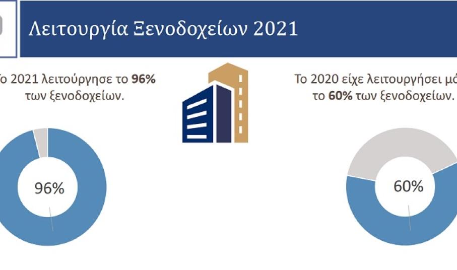 Ειδικότερα, διαπιστώνεται ότι το 2021 λειτούργησε το 96% των ελληνικών ξενοδοχείων, με μέση πληρότητα 68% και μέση τιμή του δίκλινου δωματίου τα 68 ευρώ. Τρία στα τέσσερα ξενοδοχεία ανοίξανε μεταξύ Μαΐου και Ιουλίου, ενώ ο συνολικός τζίρος τους ανήλθε σε 5,48 δις ευρώ, δηλαδή 35% χαμηλότερος από τον αντίστοιχο τζίρο του 2019.