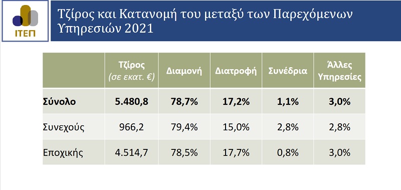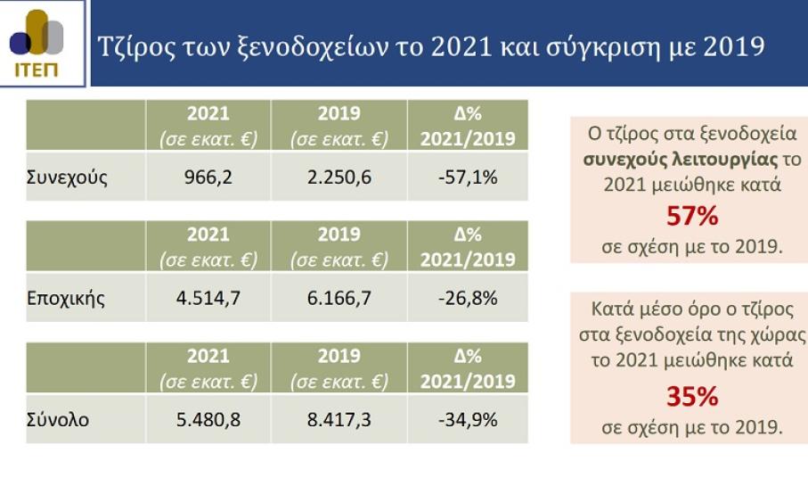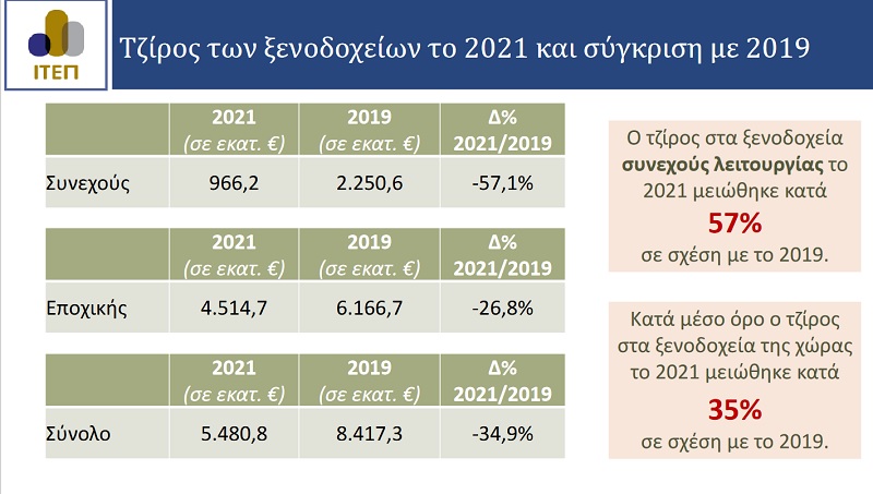 Το αποτύπωμα της πανδημίας στα βασικά οικονομικά μεγέθη των ξενοδοχειακών επιχειρήσεων, καταγράφει η ετήσια έρευνα του Ινστιτούτου Τουριστικών Ερευνών και Προβλέψεων, με τίτλο: «Οι επιδόσεις των ελληνικών ξενοδοχείων το 2021». Η έρευνα διενεργήθηκε για λογαριασμό του Ξενοδοχειακού Επιμελητηρίου Ελλάδος κατά το διάστημα 22 Νοεμβρίου- 31 Δεκεμβρίου 2021, είχε ως δείγμα 1.122 ξενοδοχειακές επιχειρήσεις.