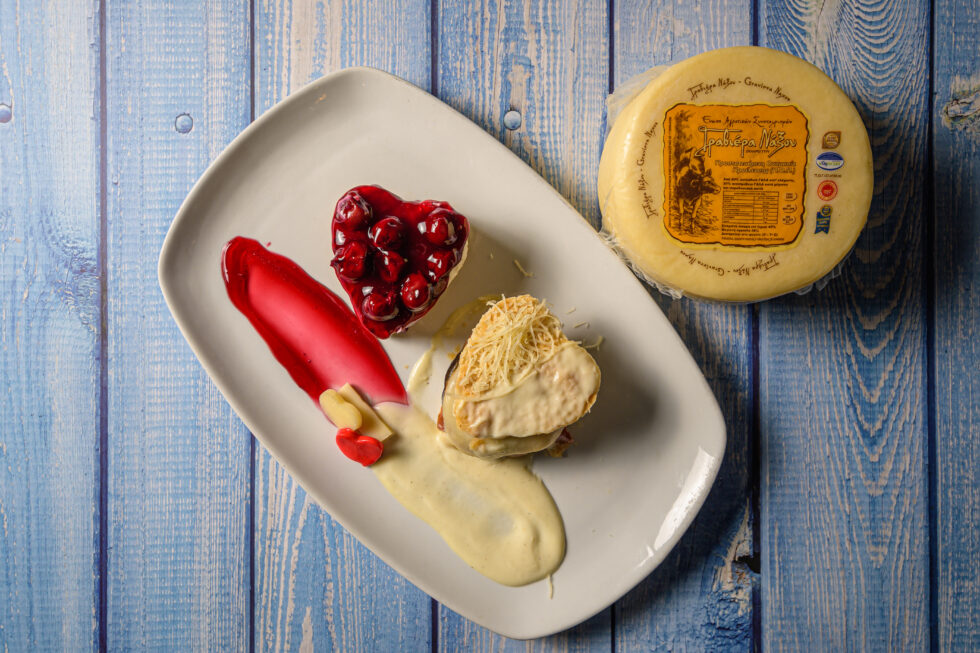 Τι προτείνει ο chef; Για κυρίως πιάτο, μιλφέιγ Γραβιέρας Νάξου Π.Ο.Π. με λαχανικά και σως Γραβιέρας και, για γλυκό, τσιζκέικ με Γραβιέρα Νάξου!