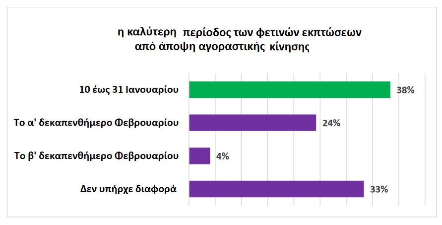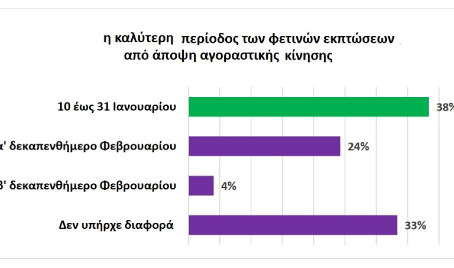 6. Η καλύτερη περίοδος των εκπτώσεων αναδείχθηκε η πρώτη περίοδος τον μήνα Ιανουάριο για το 38% των επιχειρήσεων, έπειτα ακολούθησε το πρώτο δεκαπενθήμερο του Φεβρουαρίου 24%, ενώ για σημαντικό μερίδιο επιχειρηματιών δεν σημειώθηκε κάποια διαφορά μεταξύ των περιόδων.