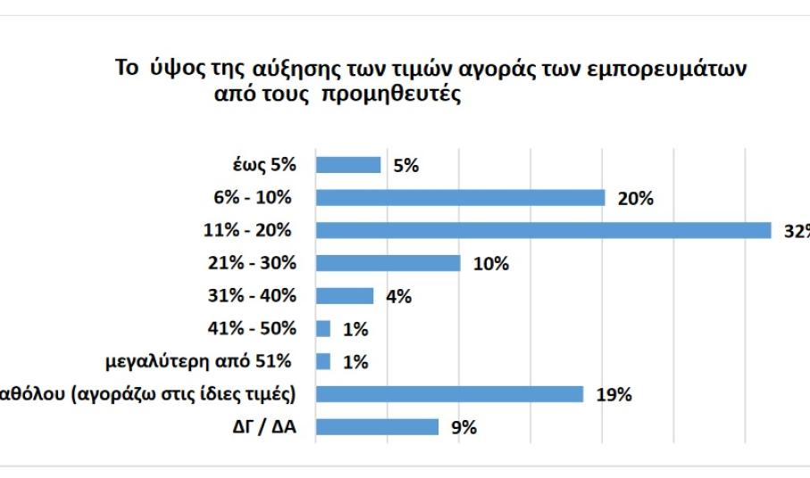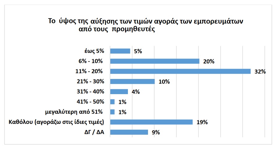 Αυτό που προκύπτει είναι ότι το 73% αγοράζει ήδη σε υψηλότερες τιμές, ενώ για το 19% μέχρι στιγμής στις ίδιες. Ειδικότερα, σε εκείνους που σημειώθηκαν αυξήσεις φαίνεται ότι αυτές κυμαίνονται έως 30%.