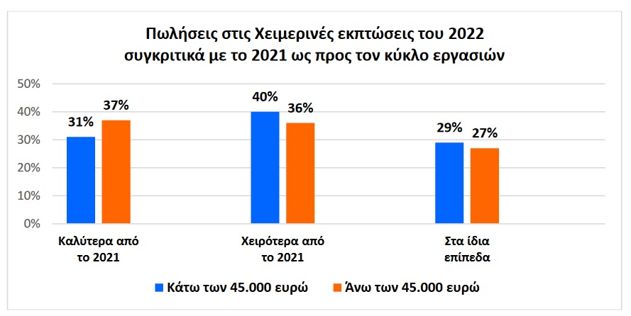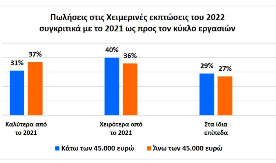 1. Για το 32% των επιχειρήσεων οι πωλήσεις κινήθηκαν σε υψηλότερο επίπεδο σε σχέση με πέρσι, το 29% στα ίδια επίπεδα, ενώ στο 39% των επιχειρήσεων οι πωλήσεις κινήθηκαν σε χαμηλότερα επίπεδα σε σχέση με το 2021. Τα αποτελέσματα διαφοροποιούνται με βάση: α) τον κλάδο δραστηριότητας, β) την περιοχή και γ) το μέγεθος της επιχείρησης.