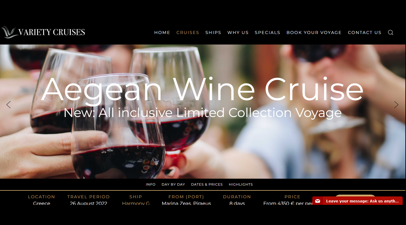 Με κεντρικό θέμα την οινογνωσία απο ελληνικά κρασιά, η Variety Cruises ανακοίνωσε την οργάνωση μιας πρωτότυπης κρουαζιέρας με επισκέψεις σε Σαντορίνη, Τήνο και Νεμέα. Η κρουαζιέρα έχει προγραμματιστεί για τις 26 Αυγούστου και θα διαρκέσει 8 ημέρες. Σύμφωνα με ανακοίνωση της εταιρίας "το κρασί θα έχει κεντρικό ρόλο σε αυτό το ταξίδι.Θα συναντήσουμε κορυφαίους οινοποιούς, θα δοκιμάσουμε κορυφαία οινοποιεία και θα απολαύσουμε δείπνα σε συνδυασμό με μια ειδικά επιλεγμένη επιλογή κρασιών - το καθένα εξερευνώντας τις υπέροχες γηγενείς ποικιλίες σταφυλιών πολλών διαφορετικών περιοχών της Ελλάδας".