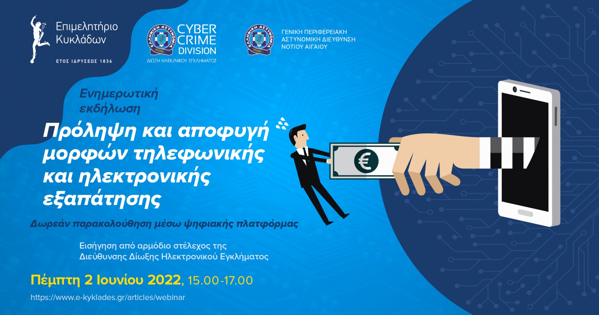 Λόγω του μεγάλου αριθμού καταγγελιών από μέλη του Επιμελητηρίου Κυκλάδων για την αύξηση των κρουσμάτων εξαπάτησης σε μια περίοδο ιδιαίτερα κρίσιμη για την έναρξη της θερινής τουριστικής σεζόν, το Επιμελητήριο Κυκλάδων διοργανώνει σε συνεργασία με την Γενική Περιφερειακή Αστυνομική Διεύθυνση Νοτίου Αιγαίου και τη Διεύθυνση Δίωξης Ηλεκτρονικού Εγκλήματος εκδήλωση ενημερωτικού και συμβουλευτικού χαρακτήρα αναφορικά με την πρόληψη και προστασία από τις τηλεφωνικές και ηλεκτρονικές απάτες προκειμένου να ενημερώσει τα μέλη του για την καλύτερη προστασία από ένα φαινόμενο που παίρνει όλο και μεγαλύτερες διαστάσεις.