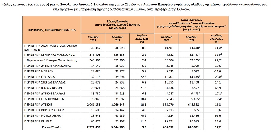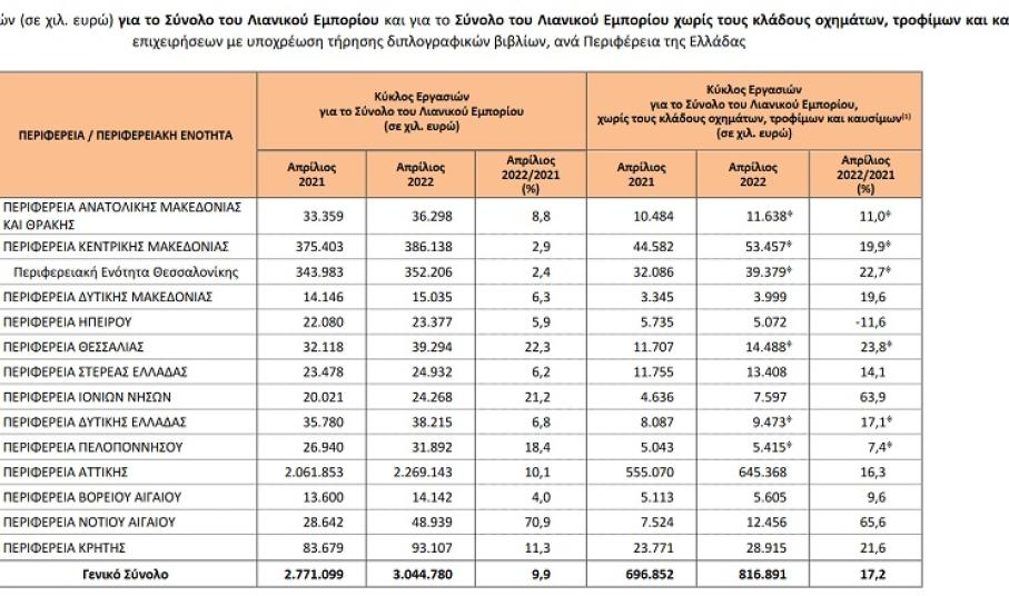 Για τις επιχειρήσεις του τομέα λιανικού εμπορίου με υποχρέωση τήρησης διπλογραφικών βιβλίων, για τις οποίες υπάρχουν διαθέσιμα στοιχεία σε μηνιαία βάση, ο κύκλος εργασιών τον Απρίλιο 2022 ανήλθε σε 3,04 δισ. ευρώ, σημειώνοντας αύξηση 9,9% σε σχέση με τον Απρίλιο 2021 που είχε διαμορφωθεί σε 2,77 δισ. ευρώ και αύξηση 8,9% σε σχέση με τον Μάρτιο του 2022 που είχε διαμορφωθεί σε 2,80 δισ. ευρώ.