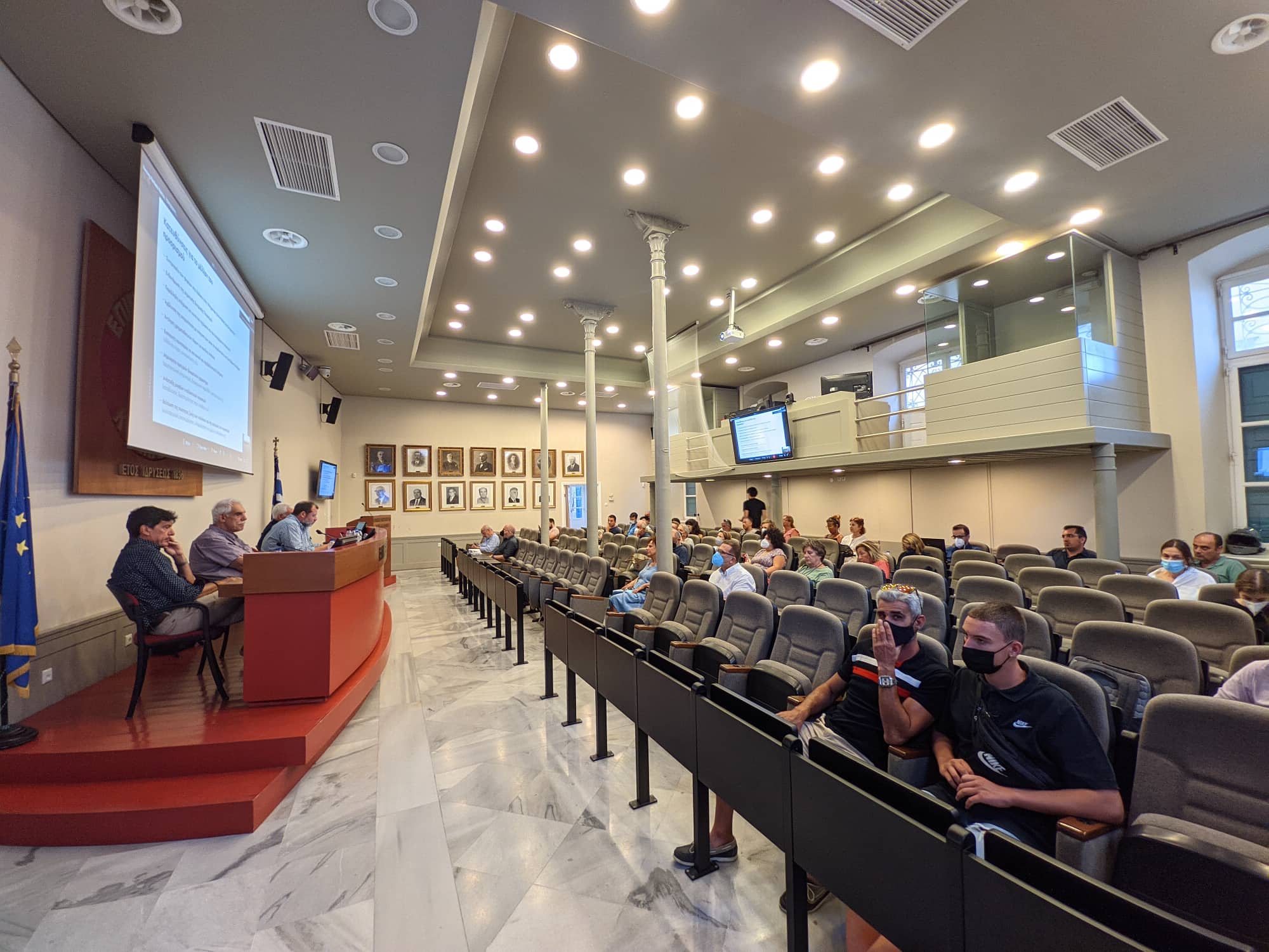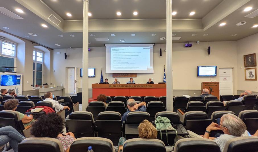 Το λόγο στη συνέχεια πήρε ο Πρόεδρος του Επιμελητηρίου Κυκλάδων, Γιάννης Ρούσσος, ο οποίος ξεκίνησε αναφέροντας πως η συζήτηση αυτή γίνεται εν μέσω παράξενων καιρών λόγω της πανδημίας και των αλλαγών που έφερε στη ζωή μας, την έκρηξη της τεχνολογίας, το φρικτό πρόσωπο του πολέμου που έκανε την εμφάνισή του μετά από σχεδόν ογδόντα χρόνια αδιατάρακτης ειρήνης στην Ευρώπη, την επιστροφή των διαχωριστικών τειχών και του Ψυχρού Πολέμου και την πλήρη απορρύθμιση της παγκόσμιας οικονομίας. Όλα αυτά, είπε, μας απέδειξαν πως τίποτα δεν μπορεί να θεωρείται δεδομένο και πως οι κοινωνίες και μαζί τους οι πολιτικές, οι αγορές και οι οικονομίες, αλλάζουν με ταχύτατους ρυθμούς, και όποιος δεν ακολουθεί και δεν προσαρμόζεται στις αλλαγές αυτές (είτε είναι κράτος, είτε πόλη, είτε νησί, είτε οργανισμός, είτε φορέας, είτε επιχείρηση, είτε κοινωνική ομάδα, είτε άτομο) μένει πίσω, και σιγά-σιγά σβήνει. Ο πλανήτης, συνέχισε ο κ. Ρούσσος, δεν θα περιμένει για πολύ ακόμα τη Σύρο να αποφασίσει τι όραμα έχει για το μέλλον της, τι στόχους βάζει για την επόμενη μέρα της, σε τι είδους κοινωνία θέλει να μεγαλώσει τα παιδιά της, σε ποιους οικονομικούς κλάδους θα δώσει προτεραιότητα για να στηρίξει την ανάπτυξή της, αν θέλει επενδύσεις ή όχι, τι είδους τουριστικούς επισκέπτες θέλει να προσελκύσει. “Η ευθύνη είναι όλων μας, όπως αναλογεί στον καθένα μας, με βάση τις αρμοδιότητες και τις υποχρεώσεις του” είπε εννοώντας πως δεν χωράνε πια προσωπικές στρατηγικές και σκοπιμότητες και επεσήμανε πως “τα ιδιαίτερα χαρακτηριστικά της Σύρου, η γεωγραφία, η παραγωγική δυνατότητα, η πληθυσμιακή σύστασή της, δεν επιτρέπουν στο νησί μας να έχει μονοδιάστατη ανάπτυξη. Επιβάλλεται να συνειδητοποιήσουμε ότι πρέπει να υπάρξουν πολλοί τομείς, ως πυλώνες ανάπτυξης, και να δημιουργήσουμε τις κατάλληλες συνθήκες για την ενίσχυσή τους” Πιο συγκεκριμένα, ο Πρόεδρος του Επιμελητηρίου αναφέρθηκε στον τουρισμό, την ενέργεια, τον πρωτογενή τομέα και τον πολιτισμό και στο ότι όλοι πρέπει να δουλέψουν με σοβαρότητα, στρατηγικό σχεδιασμό, συνέπεια, συνέργειες και ομοψυχία ώστε να δημιουργήσουν συνθήκες ευνοϊκές για να έρθουν επενδύσεις με σεβασμό στο περιβάλλον αλλά και για να γίνει γνωστό σε όλους τους ενδιαφερόμενους ότι η Σύρος είναι μια περιοχή που καλωσορίζει τις επενδύσεις, τις υποστηρίζει, και τις ενσωματώνει στην καθημερινή λειτουργία του νησιού.