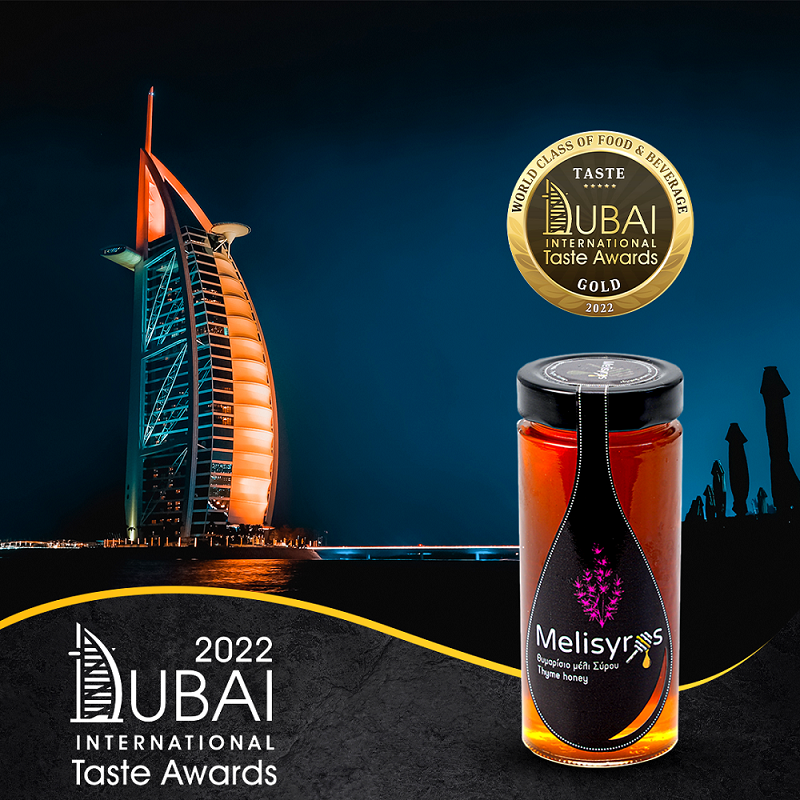 Στα DUBAI Taste Awards 2022 το θυμαρίσιο μέλι Μελίσυρος τιμήθηκε με χρυσό βραβείο και βαθμολογία 95 %, από τους διεθνείς κριτές του διαγωνισμού.