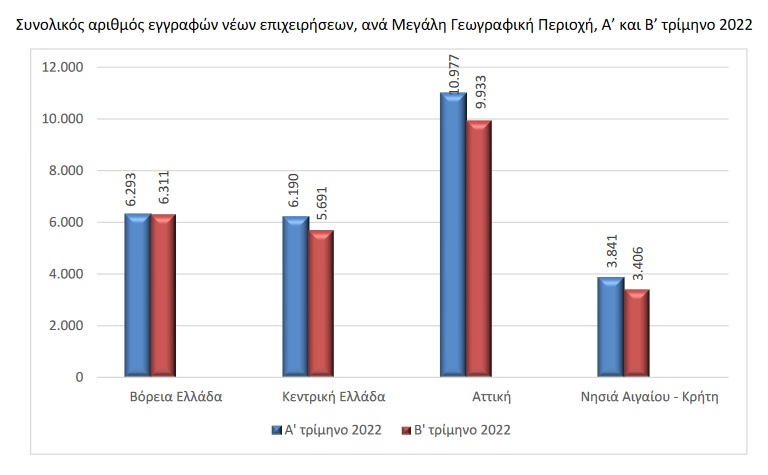 Για τους τομείς οικονομικής δραστηριότητας με τη μεγαλύτερη συνεισφορά στον συνολικό κύκλο εργασιών, σύμφωνα με τα στοιχεία του Στατιστικού Μητρώου Επιχειρήσεων έτους αναφοράς 2019, η μεγαλύτερη αύξηση στο πλήθος των εγγραφών νέων επιχειρήσεων, το Β΄ τρίμηνο 2022 σε σχέση με το Β΄ τρίμηνο 2021, καταγράφηκε στον τομέα «Μεταφορά και αποθήκευση» (36,3%) και στον τομέα «Χρηματοπιστωτικές και ασφαλιστικές δραστηριότητες» (22,5%), ενώ η αντίστοιχη μεγαλύτερη μείωση καταγράφηκε στον τομέα «Παροχή ηλεκτρικού ρεύματος, φυσικού αερίου, ατμού και κλιματισμού» (15,2%) και στον τομέα «Χονδρικό και λιανικό εμπόριο, επισκευή μηχανοκίνητων οχημάτων και μοτοσυκλετών» (13,7%).
