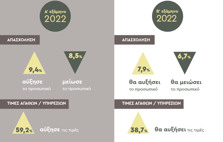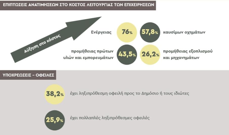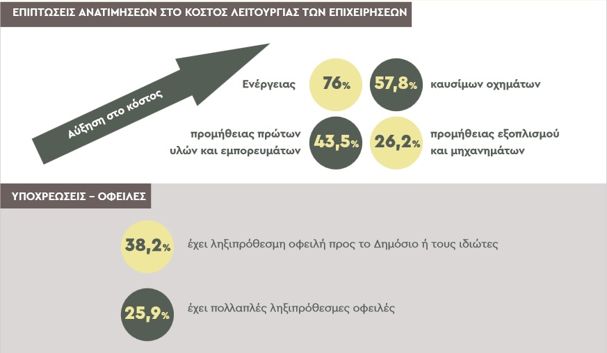 Παράλληλα, οι επιπτώσεις από τις ανατιμήσεις εντείνονται. Το κόστος λειτουργίας των επιχειρήσεων συνεχίζει να αυξάνεται καθώς με βάση τα ευρήματα της έρευνας αυξήθηκε μεσοσταθμικά το κόστος ενέργειας κατά 76%, το κόστος προμήθειας πρώτων υλών και εμπορευμάτων κατά 43,5%, το κόστος καυσίμων οχημάτων κατά 57,8% και το κόστος προμήθειας εξοπλισμού και μηχανημάτων κατά 26,2%. Συνέπεια του αυξημένου κόστους λειτουργίας ήταν να καταγραφεί νέος ιστορικά υψηλός αριθμός επιχειρήσεων που αύξησαν τις τιμές πώλησης αγαθών/υπηρεσιών. Το πρώτο εξάμηνο του 2022, 6 στις 10 μικρές και πολύ μικρές επιχειρήσεις (59,2%) προχώρησαν σε αύξηση των τιμών τους.