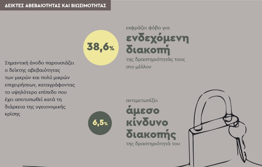 Τέλος, αρνητικές παραμένουν οι προσδοκίες για το μέλλον. Σημαντική, μάλιστα, άνοδο παρουσιάζει ο δείκτης αβεβαιότητας των μικρών και πολύ μικρών επιχειρήσεων, καταγράφοντας το υψηλότερο επίπεδο που έχει αποτυπωθεί από την εκδήλωση της υγειονομικής κρίσης. Συγκεκριμένα, σχεδόν 4 στις 10 επιχειρήσεις (38,6%) εκφράζουν φόβο για ενδεχόμενη διακοπή της δραστηριότητάς τους στο μέλλον. Αντίστοιχα, ο δείκτης βιωσιμότητας των μικρών και πολύ μικρών επιχειρήσεων καταγράφει το χειρότερο ποσοστό από την έναρξη της υγειονομικής κρίσης με το 6,5% των μικρών και πολύ μικρών επιχειρήσεων να αντιμετωπίζει άμεσο κίνδυνο διακοπής της δραστηριότητας του.