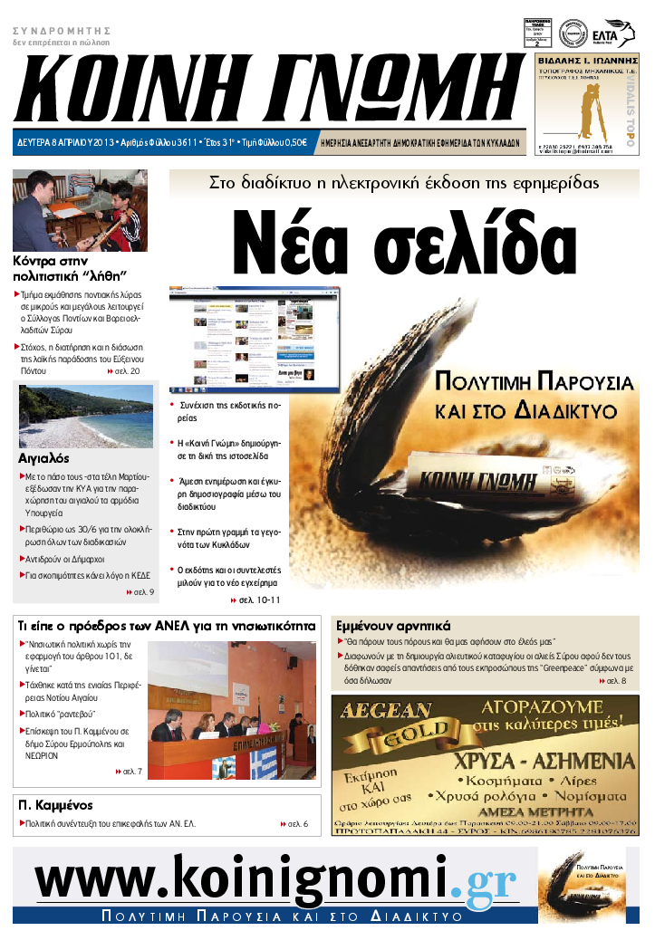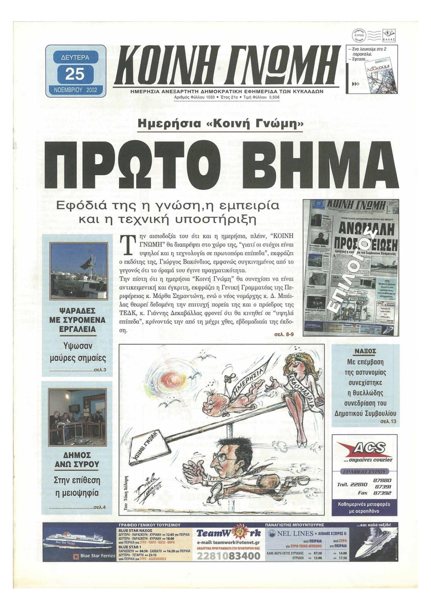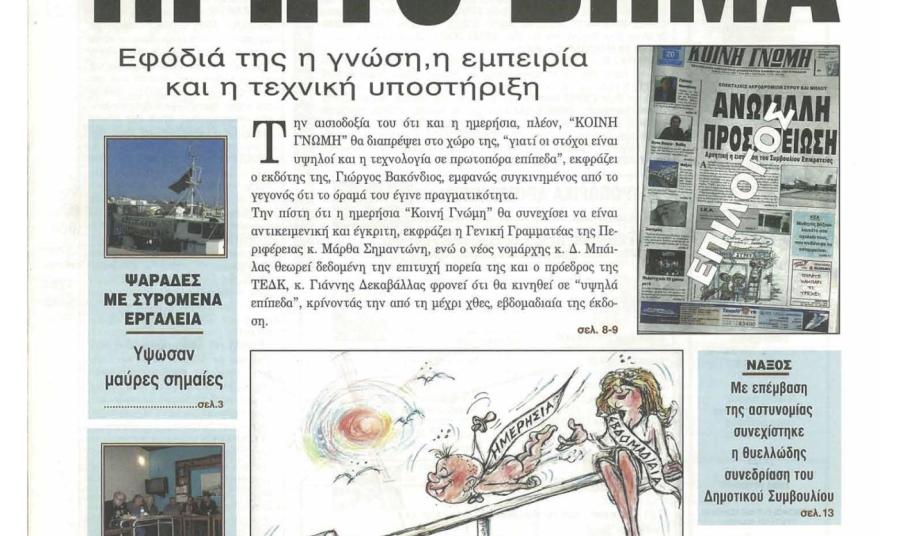 Αρκεί, µια γρήγορη ανασκόπηση, στο διαθέσιµο αρχείο της «Κοινή Γνώµης», από το πρώτο φύλλο της έκδοσης της, στον ειδικά διαµορφωµένο χώρο του portal µας, σε όποιον το επιθυµεί, για να διαπιστώσει την εξέλιξη της εφηµερίδας, παράλληλα µε τις αντίστοιχες χρονικά, καινοτόµες δυνατότητες, της “Τυποκυκλαδικής”.