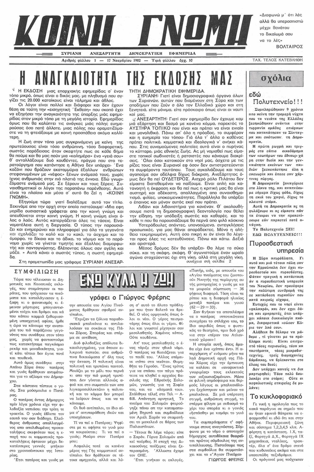 Ήταν Τετάρτη, 17η Νοεµβρίου 1982, όταν κυκλοφόρησε το πρώτο φύλλο, του νέου εντύπου, µε τίτλο “Κοινή Γνώµη”. Ένα 4σέλιδο, 29χ43 εκατ. Το οποίο, τα δεδοµένα της εποχής, µας επέτρεπαν να ονοµάζουµε εφηµερίδα.