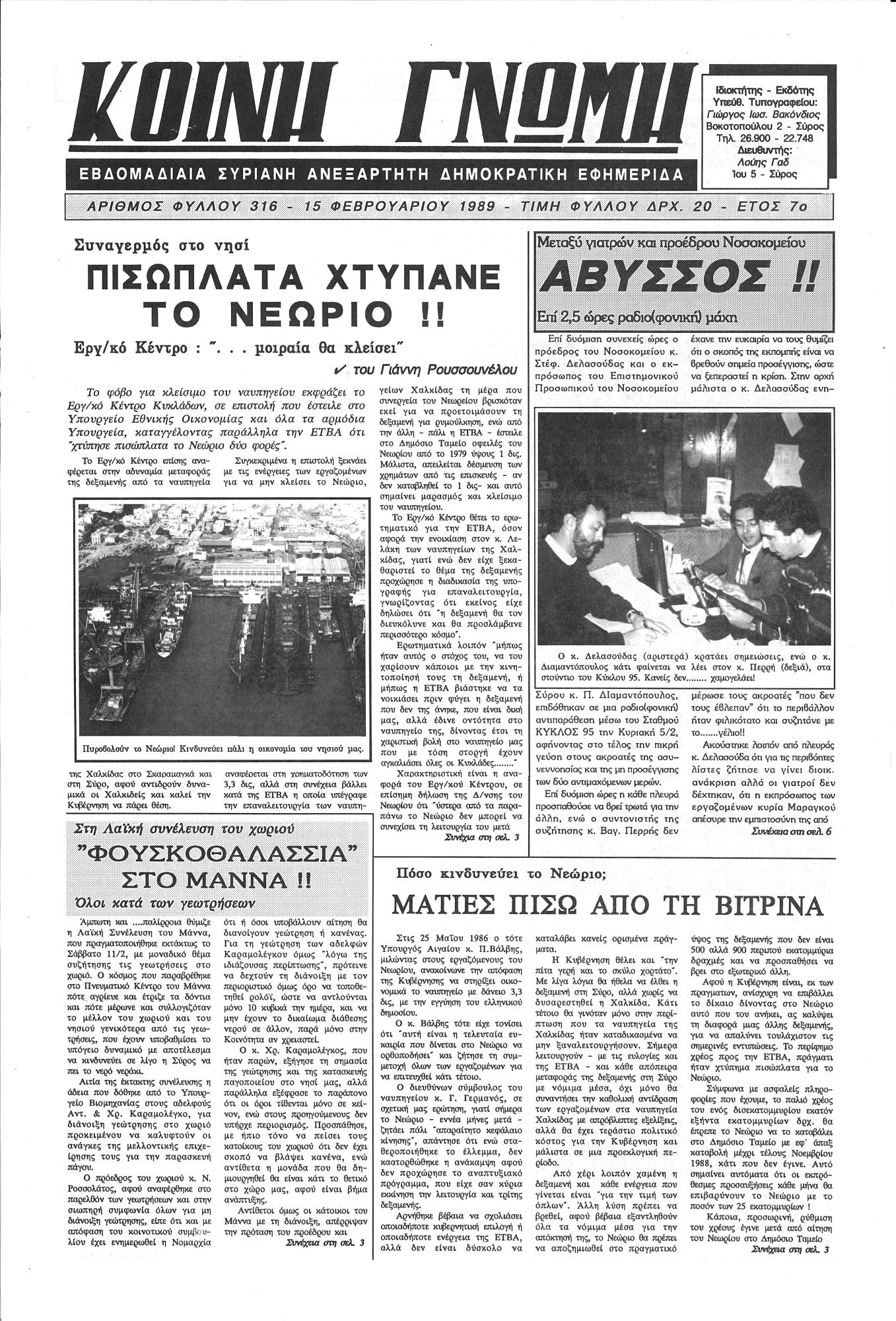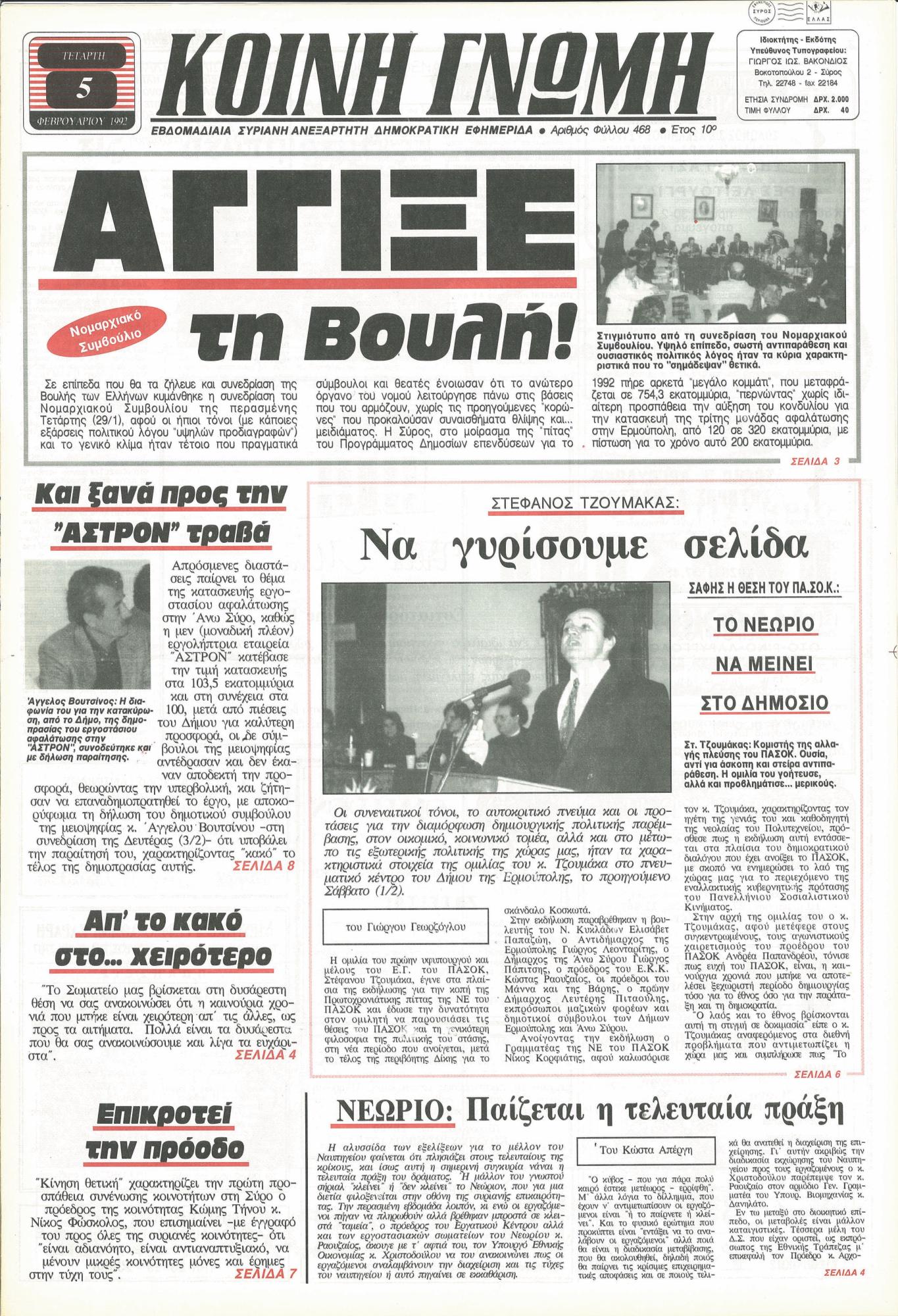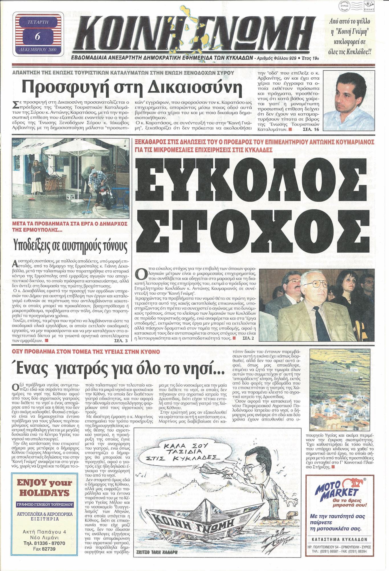 Τον ∆εκέµβριο του ίδιου έτους, η «Κοινή Γνώµη», πραγµατοποιεί διευρυµένο άνοιγµα στις Κυκλάδες, µε την άφιξη δυο καινούργιων πιεστηρίων, καθιερώνεται το χρώµα στο εξώφυλλο και το οπισθόφυλλο. Η κυκλοφορία, αγγίζει τις 5.000 φύλλα.