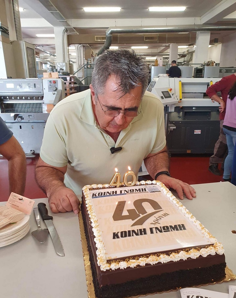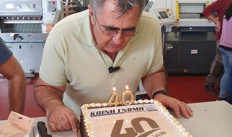 Ο ίδιος πλαισιωμένος από την οικογένειά του, αλλά και από αρκετά άτομα της επιχείρησης καθώς ορισμένοι συνεργάτες απουσίαζαν για ανειλημμένες υποχρεώσεις της εφημερίδας και του τυπογραφείου, έσβησε τα κεράκια, στο πλαίσιο μίας λιτής γιορτής που πραγματοποιήθηκε για την επέτειο των 40 ετών έκδοσης της “Κοινής Γνώμης”.