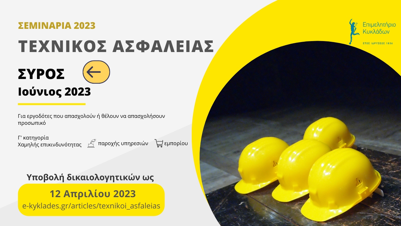 Το Επιμελητήριο Κυκλάδων ανακοινώνει τη δια ζώσης διοργάνωση και 2ου σεμιναρίου Τεχνικού Ασφαλείας στη Σύρο μετά την εκδήλωση ενδιαφέροντος επιχειρηματιών του νησιού.