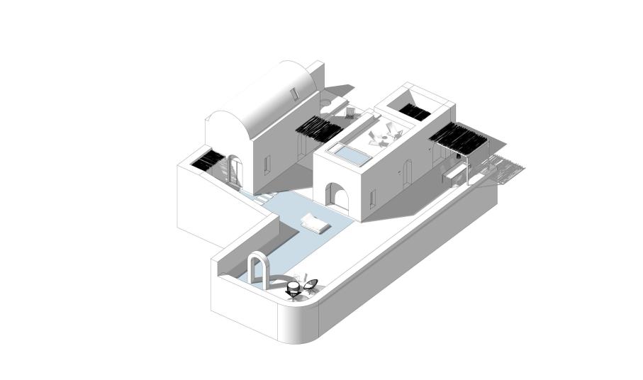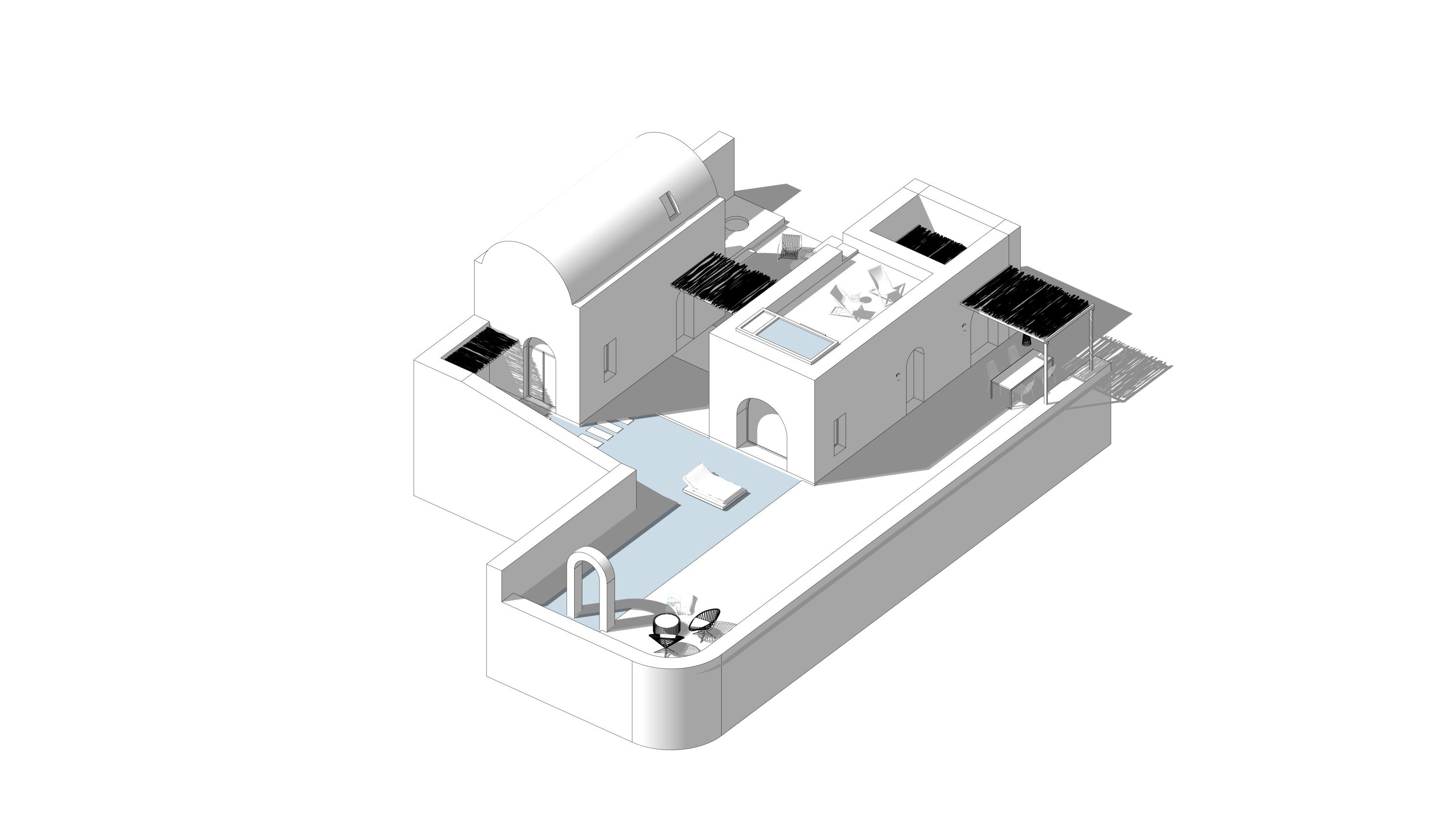 Ο σχεδιασμός έγινε με αναφορά στα αγροτικά σπίτια της Θήρας που βρίσκονται στην εξοχή ή στην περίμετρο των οικισμών, τα οποία αποτελούνται από ένα σύνολο αυτόνομων μικρών κτισμάτων μέσα σε περίκλειστες αυλές που φιλοξενούν κύριες ή βοηθητικές χρήσεις. Το συγκρότημα αποτελείται από 8 μονολιθικούς όγκους παραλληλόγραμμου σχήματος με θολωτές οροφές. Στο κτιριακό μονόχωρο όγκο που φιλοξενεί την κουζίνα και το καθημερινό η θολωτή οροφή είναι εμφανής στο εσωτερικό χώρο αλλά εξωτερικά συμπληρώνεται δημιουργώντας ένα βατό δώμα, ενώ στον κτίσμα που φιλοξενεί το υπνοδωμάτιο και το λουτρό δημιουργείται εσωτερικός εξώστης για βοηθητικό υπνοδωμάτιο και η στέγαση γίνεται κατά μήκος των στενών τοιχοποιιών με εμφανή θόλο. Τους όγκους πλαισιώνουν δεξαμενές με νερό που συμβάλλουν στον αερισμό και στον δροσισμό του συγκροτήματος.