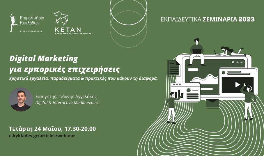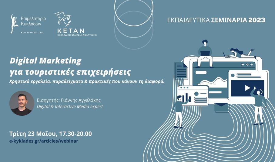 Δύο νέα δυναμικά webinar σχετικά με την αξιοποίηση του digital marketing και των κατάλληλων εργαλείων και πρακτικών για τη δημιουργία περιεχομένου και τη βελτίωση της συνολικής εταιρικής online παρουσίας των επιχειρήσεων σχεδιάζει το Επιμελητήριο Κυκλάδων για Τρίτη 23 Μαΐου 2023, για τουριστικές επιχειρήσεις  και Τετάρτη 24 Μαΐου 2023, για εμπορικές επιχειρήσεις τις ώρες 17.30-20.00.