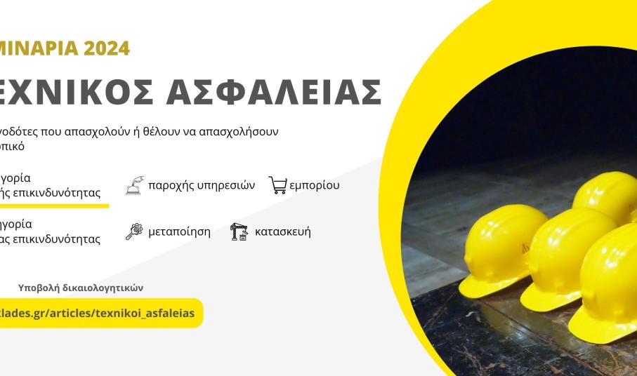 Το Επιμελητήριο Κυκλάδων ανακοινώνει τις καταληκτικές ημερομηνίες υποβολής ενδιαφέροντος για συμμετοχή στα επιμορφωτικά προγράμματα σε θέματα άσκησης καθηκόντων Τεχνικού Ασφαλείας που θα πραγματοποιηθούν το πρώτο εξάμηνο 2024 και αφορούν επιχειρήσεις των κλάδων εμπορίου και παροχής υπηρεσιών που ανήκουν στη χαμηλή επικινδυνότητα, Γ' κατηγορία.