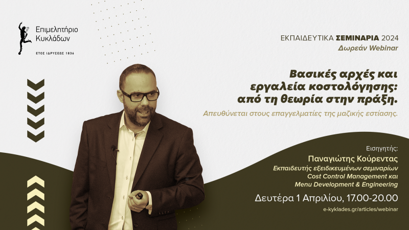 Το πρώτο σεμινάριο που πραγματοποιείται σήμερα (17.00-20.00) έχει θέμα “Βασικές αρχές & εργαλεία κοστολόγησης: από τη θεωρία στην πράξη”. Σύμφωνα με όσα εξηγεί ο πρόεδρος: “Είναι ένα πολύ σημαντικό σεμινάριο γιατί το θέμα της κοστολόγησης στην εποχή που έχουν αυξηθεί τα “κρυφά” έξοδα και η βιωσιμότητα των επιχειρήσεων είναι οριακή, μόνο με επαγγελματική προσέγγιση στην κοστολόγηση μπορεί μια επιχείρηση να παραμείνει υγιής”. Το συγκεκριμένο webinar απευθύνεται σε όσους δραστηριοποιούνται στον χώρο της μαζικής εστίασης (καταλύματα, εστιατόρια, καφέ, μπαρ, πιτσαρίες, κ.α.). Εισηγητής θα είναι ο Παναγιώτης Κούρεντας, εκπαιδευτής εξειδικευμένων σεμιναρίων γύρω από το Cost Control Management και το Menu Development & Engineering. “Είναι ένας σπουδαίος εκπαιδευτής που μεταδίδει την απαραίτητη πληροφόρηση με πρακτικό τρόπο”, διευκρινίζει ο κ. Ρούσσος, λέγοντας πως ενδεικτικά θα αναλυθούν θέματα που αφορούν: α. στις βέλτιστες μεθόδους υπολογισμού και τον έλεγχο του κόστους μέσα από μια διαδραστική προσέγγιση, β. στο πώς αναγνωρίζει κανείς τα λειτουργικά κόστη και τη σημασία τους στην ορθή κοστολόγηση φαγητού και ποτού, γ. στον περιορισμό της σπατάλης υλικών προκειμένου να εξασφαλίσουν τη βιωσιμότητα αλλά και την επιβίωση των επιχειρήσεων και δ. στην ανάλυση της τιμολόγησης και κερδοφορίας με τρόπο που θα βοηθήσει στην επιλογή της μεθόδου τιμολόγησης που ταιριάζει καλύτερα στην κάθε επιχείρηση, ακολουθώντας όλες τις διεθνείς τάσεις και τα νέα πρότυπα.