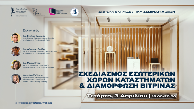 Εισηγητές θα είναι οι: Δρ. Στέλιος Ζερεφός, καθ. Σχολής Εφαρμοσμένων Τεχνών και Βιώσιμου Σχεδιασμού, ΕΑΠ. Δρ. Λάμπρος Δούλος, αν. καθ. Σχολής Εφαρμοσμένων Τεχνών και Βιώσιμου Σχεδιασμού, ΕΑΠ. Δρ. Μάρω Σίνου, αν. καθ. Τμήματος Εσωτερικής Αρχιτεκτονικής, Πανεπιστήμιο Δυτικής Αττικής και Κατερίνα Σκάλκου, αρχιτέκτονας / σχεδιαστής φωτισμού (συνεργαζόμενο Εκπαιδευτικό Προσωπικό ΕΑΠ, ακαδημαϊκός υπότροφος Πανεπιστημίου Δυτικής Αττικής). Κάποια από τα θέματα που θα αναλυθούν: α. Αναγνώριση ιδιαίτερων χαρακτηριστικών των χώρων, της χρήσης και των χρηστών, β. διαμόρφωση κεντρικής ιδέας σχεδιασμού, γ. λειτουργική διάταξη - ζώνη εισόδου και βιτρίνας, χώρος ταμείου, χώρος πώλησης εμπορεύματος, δοκιμαστήρια, αποθήκευση, γραφείο, χώρος προσωπικού, διάγραμμα κινήσεων, δ. σχεδιασμός βιτρίνας, ε. Παρουσίαση διαχρονικών τάσεων και σύγχρονων trend μέσα από επιλεγμένα παραδείγματα.