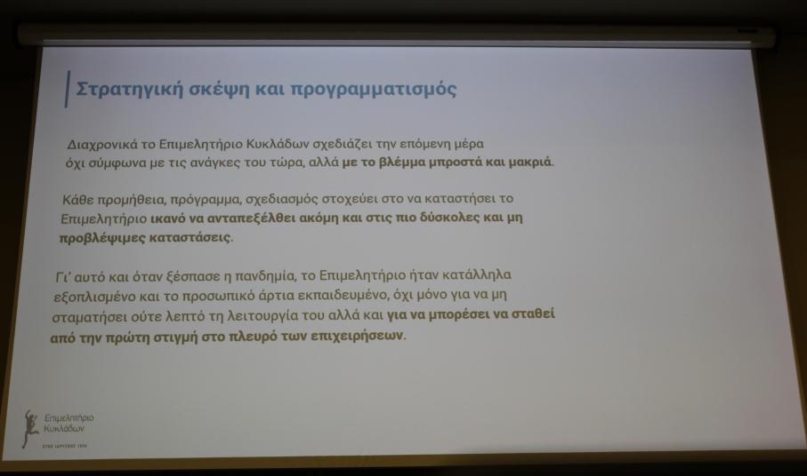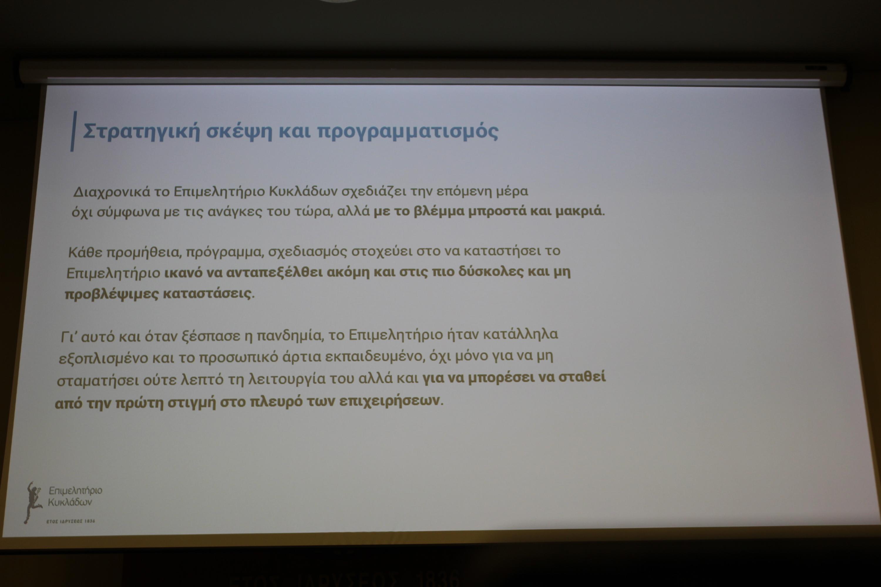 2. Αξιοσημείωτη ήταν η ετοιμότητα από την πρώτη ημέρα για την ενημέρωση, την εκπαίδευση και την προετοιμασία των μελών του για το άνοιγμα την περίοδο του covid. Όπως  σημείωσε, “περισσότεροι από 22.500 συμμετέχοντες παρακολούθησαν τα webinar για τα νέα πρωτόκολλα και τους κανονισμούς Υγιεινής και Ασφάλειας στο χώρο της μαζικής εστίασης και των τουριστικών καταλυμάτων, ενώ περισσότεροι από 6.500 από αυτούς ήρθαν για πρώτη φορά σε επαφή με τις νέες ψηφιακές τεχνολογίες και τη λογική της εξ αποστάσεως εκπαίδευσης και εκπαιδεύτηκαν ένας προς έναν σε αυτό από την ομάδα των στελεχών του Επιμελητηρίου Κυκλάδων”. Συνολικά από την εποχή της πανδημίας και μετά έχουν πραγματοποιηθεί περισσότερα από 60 διαδραστικά webinar με περισσότερους από 40.000 συμμετέχοντες.