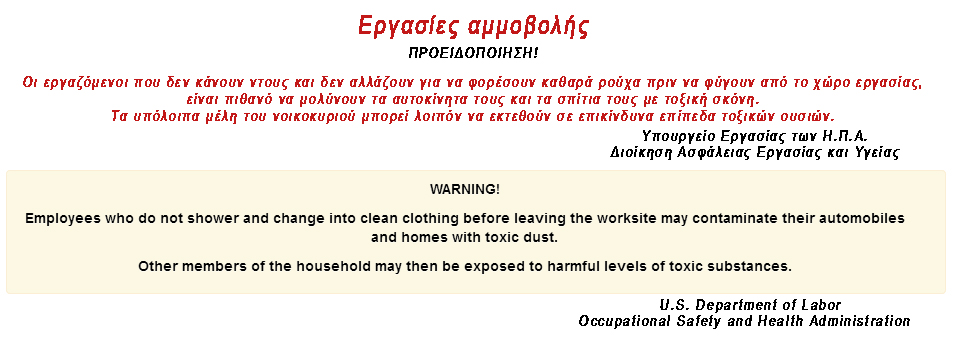 Για να διαπιστώσουμε όμως ποιος διαδίδει «χυδαία ψέματα» μπορούμε να ανατρέξουμε σε διάφορες πηγές. Επιλέγω το Υπουργείο Εργασίας των Ηνωμένων Πολιτειών (δεδομένου ότι η αμερικάνικη σημαία κυματίζει στην είσοδο του Ναυπηγείου), που υποστηρίζει ότι οι εργασίες των αμμοβολών προκαλούν έκθεση σε τοξικά συστατικά που μπορούν να προκαλέσουν διάφορες ασθένειες μεταξύ των οποίων και αρκετοί τύποι καρκίνου.