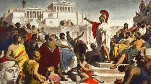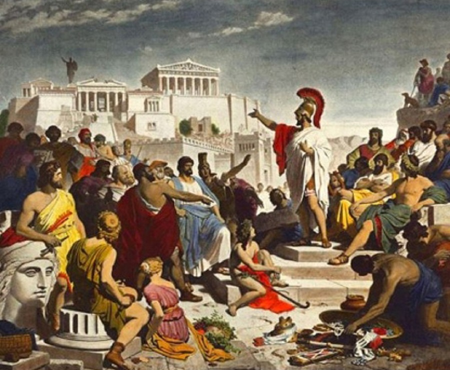 Ανάμεσα στην Ανατολή και τη Δύση βρισκόταν η Ελλάδα, που όμως δεν ήταν κράτος. Πολύ νωρίς η βασιλεία, οπως τον καιρό του Αγαμέμνονα και των λοιπών μυθικών ηρώων, είχε καταργηθεί, με εξαίρεση τη Μακεδονία, που ποτέ δεν έπαψε να είναι βασίλειο. Στους Έλληνες κάθε πόλη ήταν και κράτος. Άλλα κράτη είχαν πολίτευμα που ήταν ουσιαστικά ένα είδος ολιγαρχίας και άλλα, με πρότυπο τις Αθήνες, ήταν δημοκρατίες. Αυτό σημαίνει πως τη νομοθετική και δικαστική εξουσία την ασκούσαν όλοι οι πολίτες εκ περιτροπής, που επιλέγονταν με κλήρωση, όπως σήμερα οι ένορκοι στα ποινικά δικαστήρια. Στις δημοκρατίες υπήρχε κοινή γλώσσα και αυτό που ονομάζομε σήμερα ιδανική γραφή, δηλαδή κάθε φθόγγος συμβολιζόταν με ένα γράμμα και κάθε γράμμα συμβόλιζε ένα φθόγγο. Αυτή η απλότητα, που δεν υπήρχε σε κανένα άλλο είδος γραφής, ιερογλυφικά, ιδεογράμματα, συλλαβικές γραφές, όπως η γραμμική Β, και άλλες, επέτρεπε να είναι εγγράμματοι όλοι πρακτικά οι πολίτες και να εκφέρουν γραπτά, σχεδόν ανεξίτηλα και σε κοινή θέα, τη γνώμη και τη βούλησή τους. Προφανώς, χωρίς αυτή την τεχνολογική πρόοδο, θα ήταν αδύνατη η λειτουργία της δημοκρατίας.