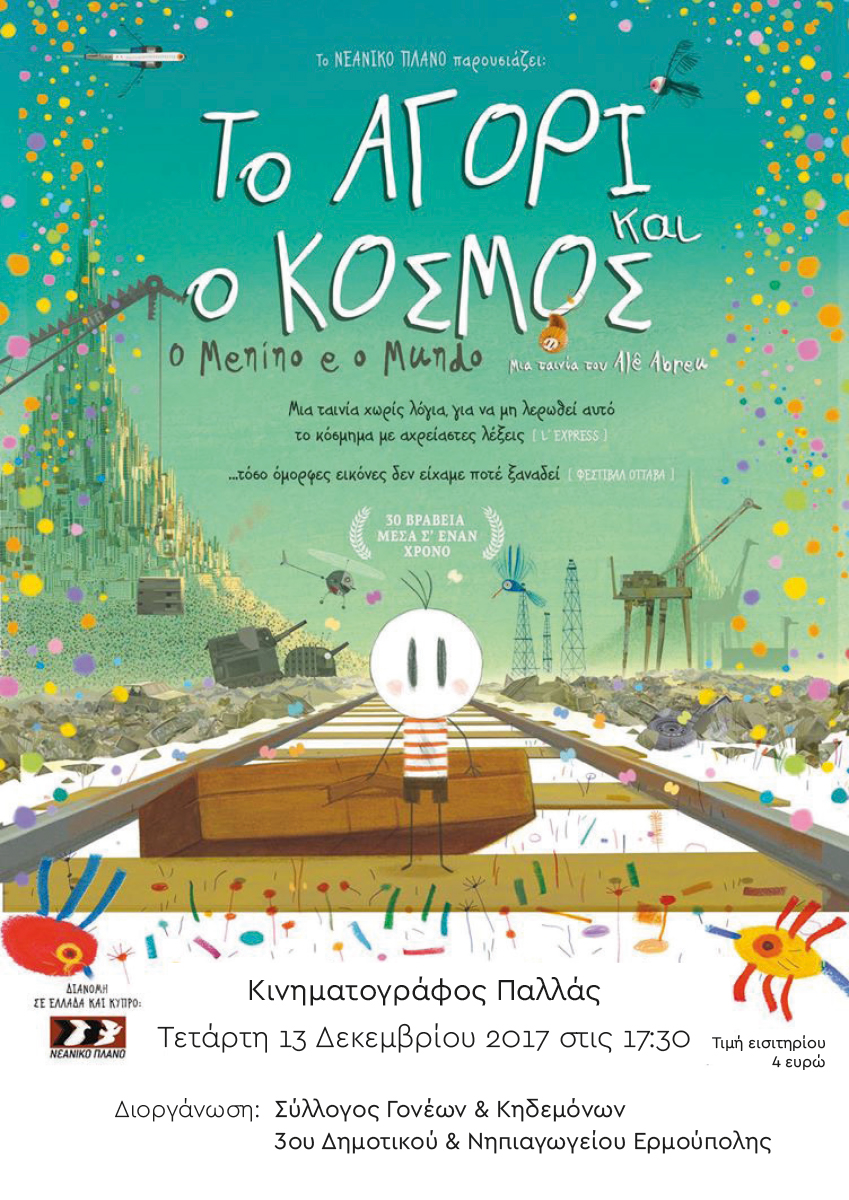 Η ταινία Το Αγόρι και ο Κόσμος, θα προβληθεί την Τετάρτη 13 Δεκεμβρίου 2017, στις 17.30, στον κινηματογράφο Παλλάς. Τα έσοδα από την προβολή της ταινίας θα διατεθούν για την ενίσχυση της σχολικής βιβλιοθήκης.