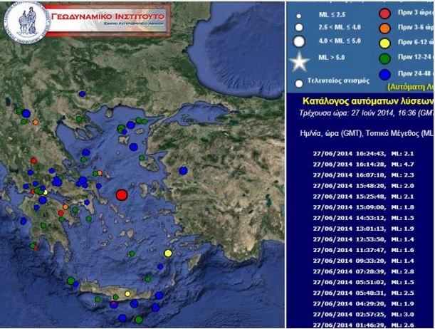 Σεισμική δόνηση μεγέθους 4,7 βαθμών της κλίμακας Ρίχτερ σημειώθηκε στις 19.14 στην περιοχή των Κυκλάδων και έγινε αισθητή μέχρι και στην Αθήνα χθες σύμφωνα με όσα αναφέρει επίσημα η ιστοσελίδα του Γεωδυναμικού Ινστιτούτου.