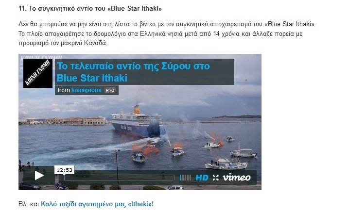Το εν λόγω βίντεο συνοδεύεται από το σχόλιο που ακολουθεί: "Δεν θα μπορούσε να μην είναι στη λίστα το βίντεο με τον συγκινητικό αποχαιρετισμό του «Blue Star Ithaki». Το πλοίο αποχαιρέτησε το δρομολόγιο στα Ελληνικά νησιά μετά από 14 χρόνια και άλλαξε πορεία με προορισμό τον μακρινό Καναδά".