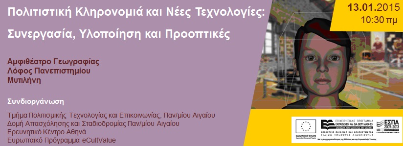 Το Τμήμα Πολιτισμικής Τεχνολογίας και Επικοινωνίας του Πανεπιστημίου Αιγαίου, σε συνεργασία με τη Δομή Απασχόλησης και Σταδιοδρομίας (Δ.Α.ΣΤΑ.) του Πανεπιστημίου Αιγαίου, το Ερευνητικό Κέντρο Αθηνά και το Ευρωπαϊκό Πρόγραμμα eCultvalue, την Τρίτη 13 Ιανουαρίου 2015 και ώρα 10:30, διοργανώνουν στη Μυτιλήνη ημερίδα με θέμα: