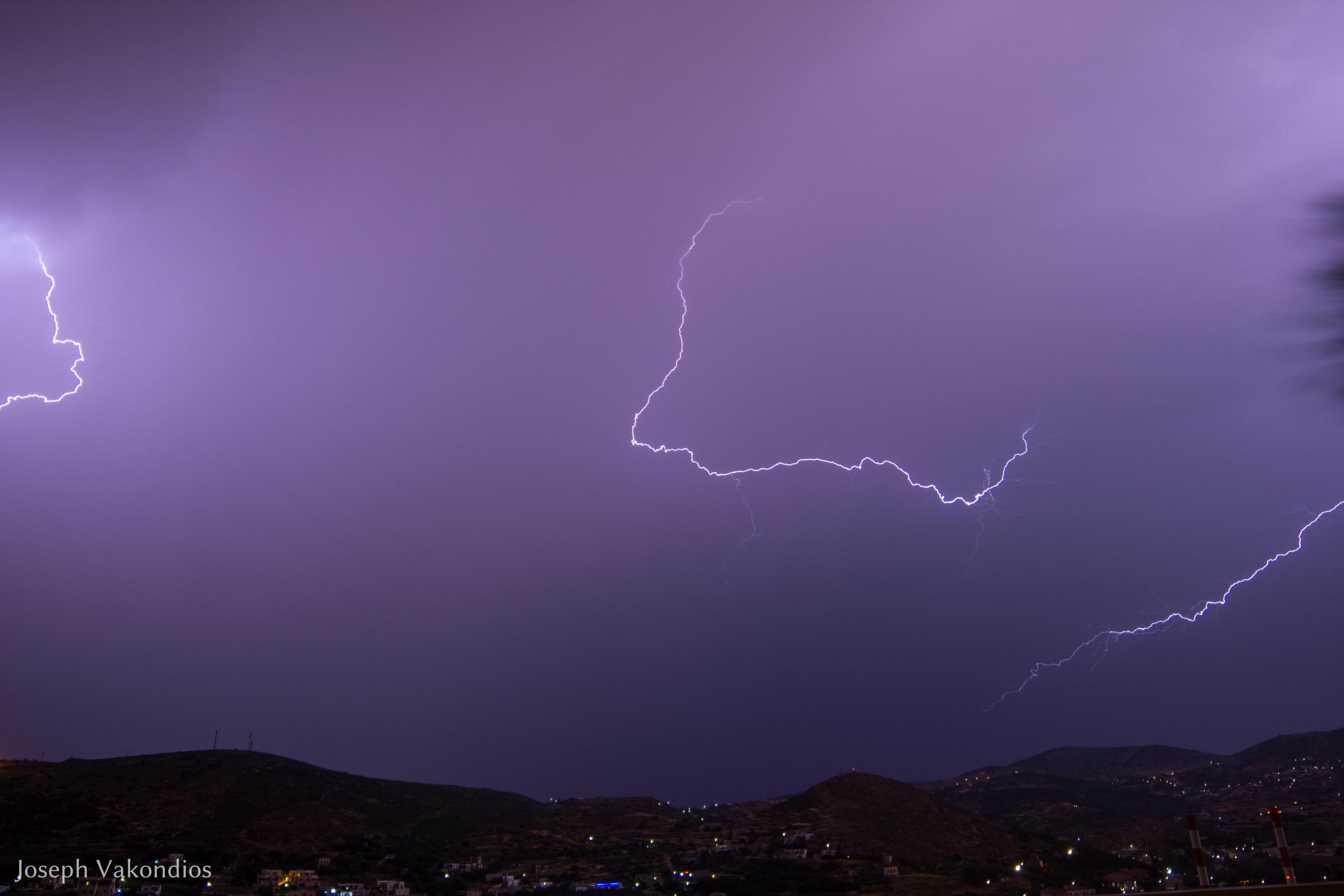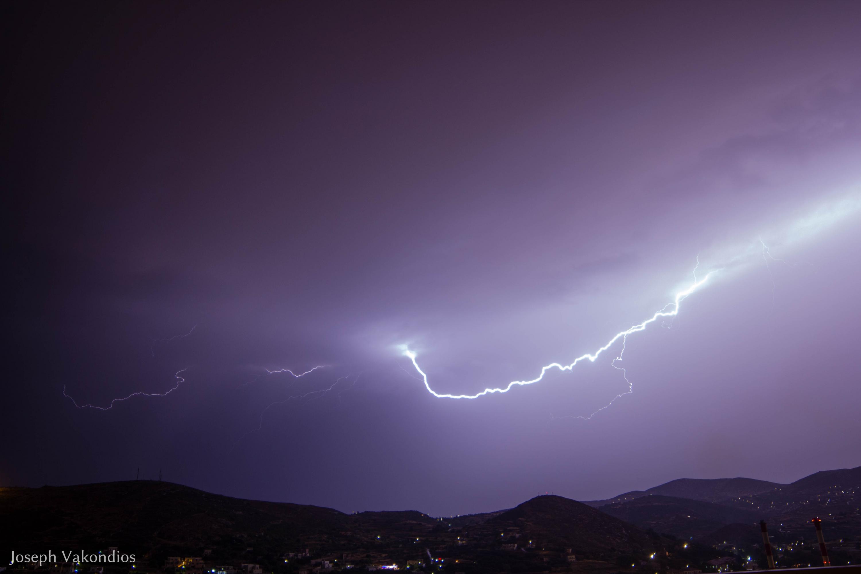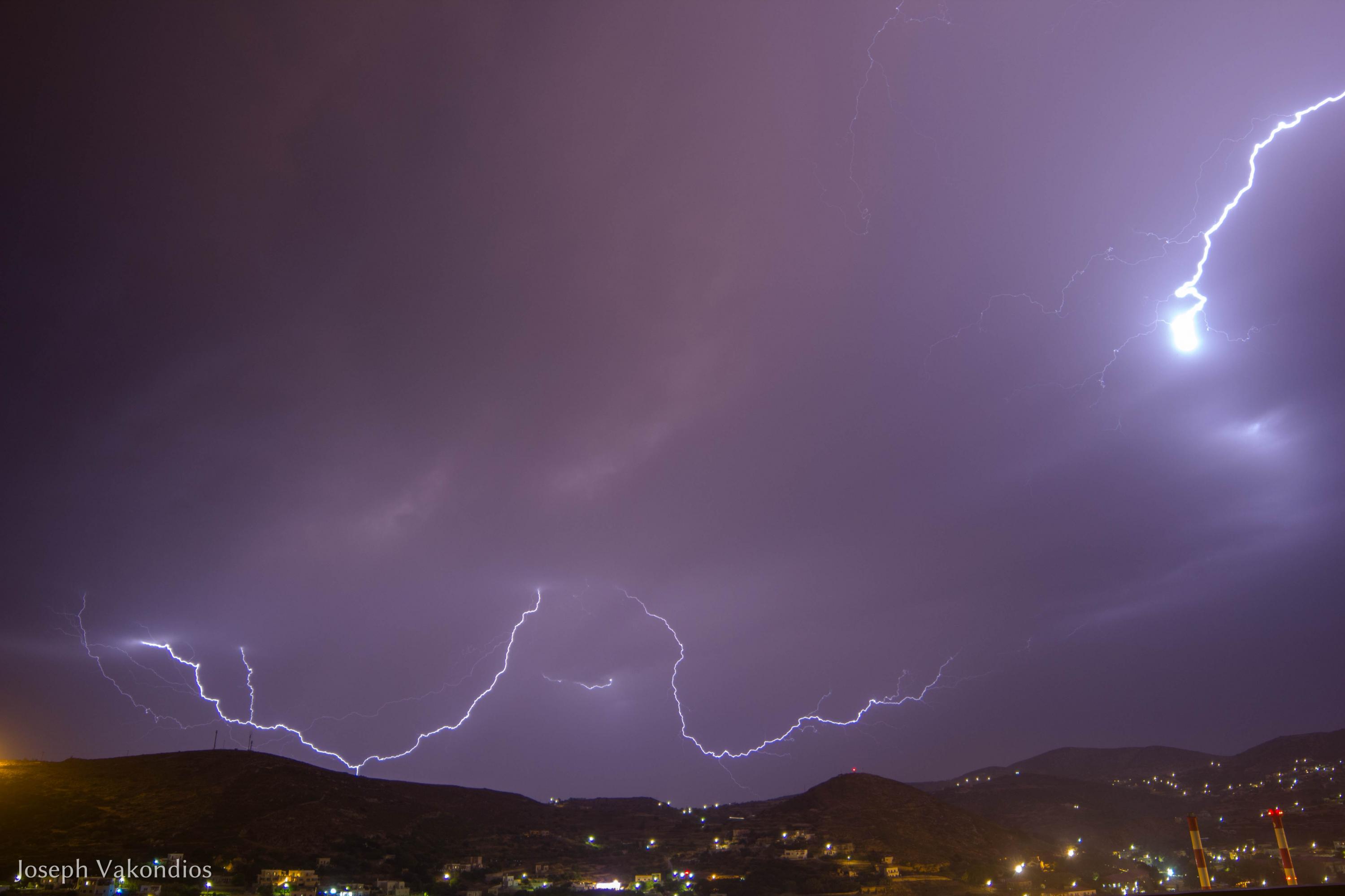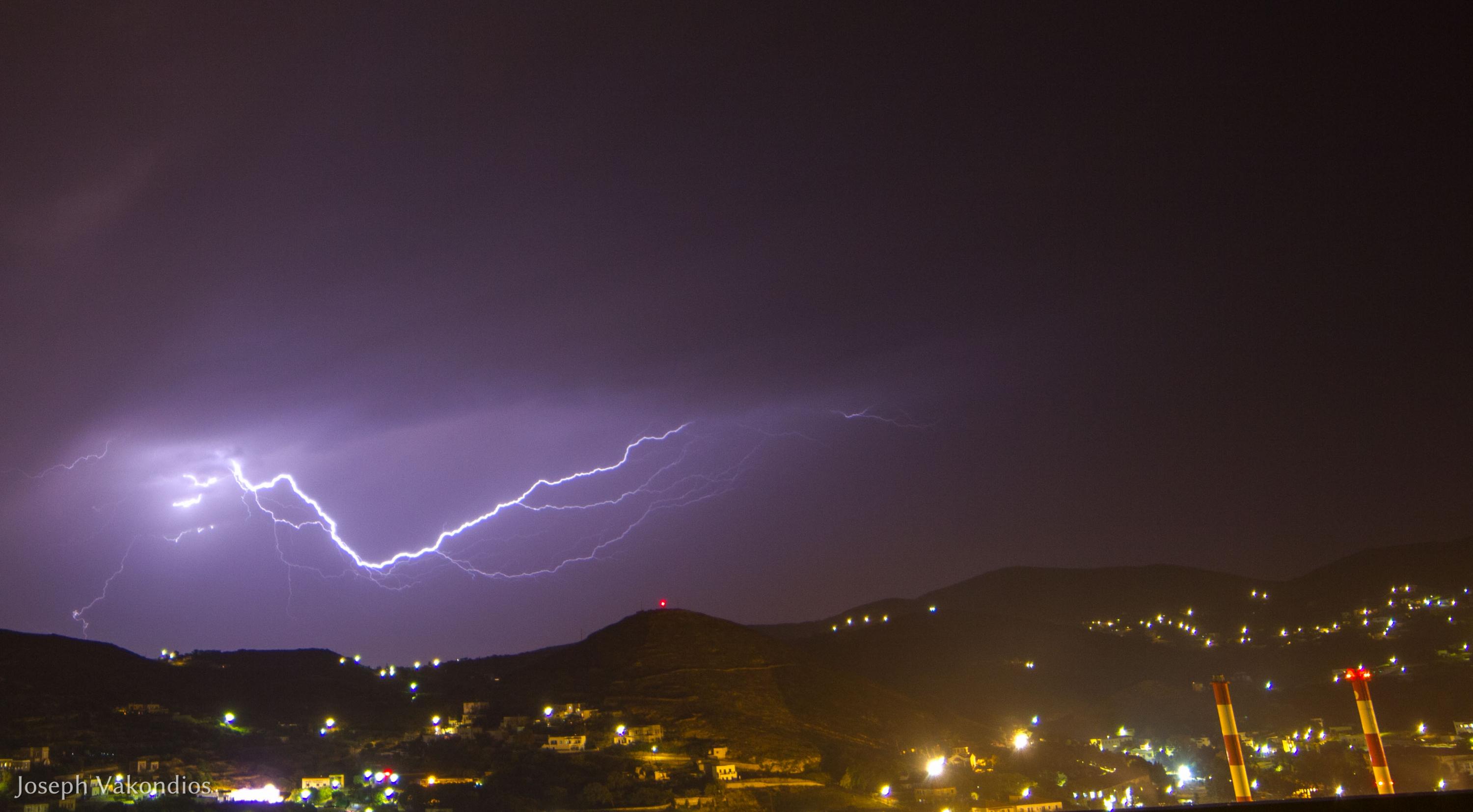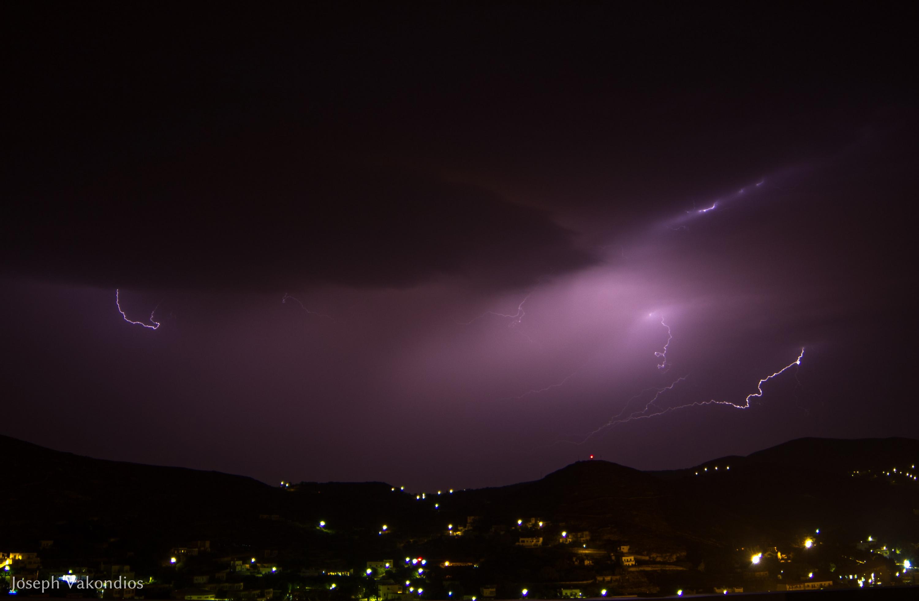 Μία από τις πιο εντυπωσιακές επιδείξεις δύναμης της μητέρας φύσης κατέγραψε χθες το βράδυ ο φακός της “Κοινής Γνώμης”, από τα γραφεία της Τυποκυκλαδικής στο Μάννα, λίγες μόνο ημέρες πριν από την έναρξη της καλοκαιρινής περιόδου.